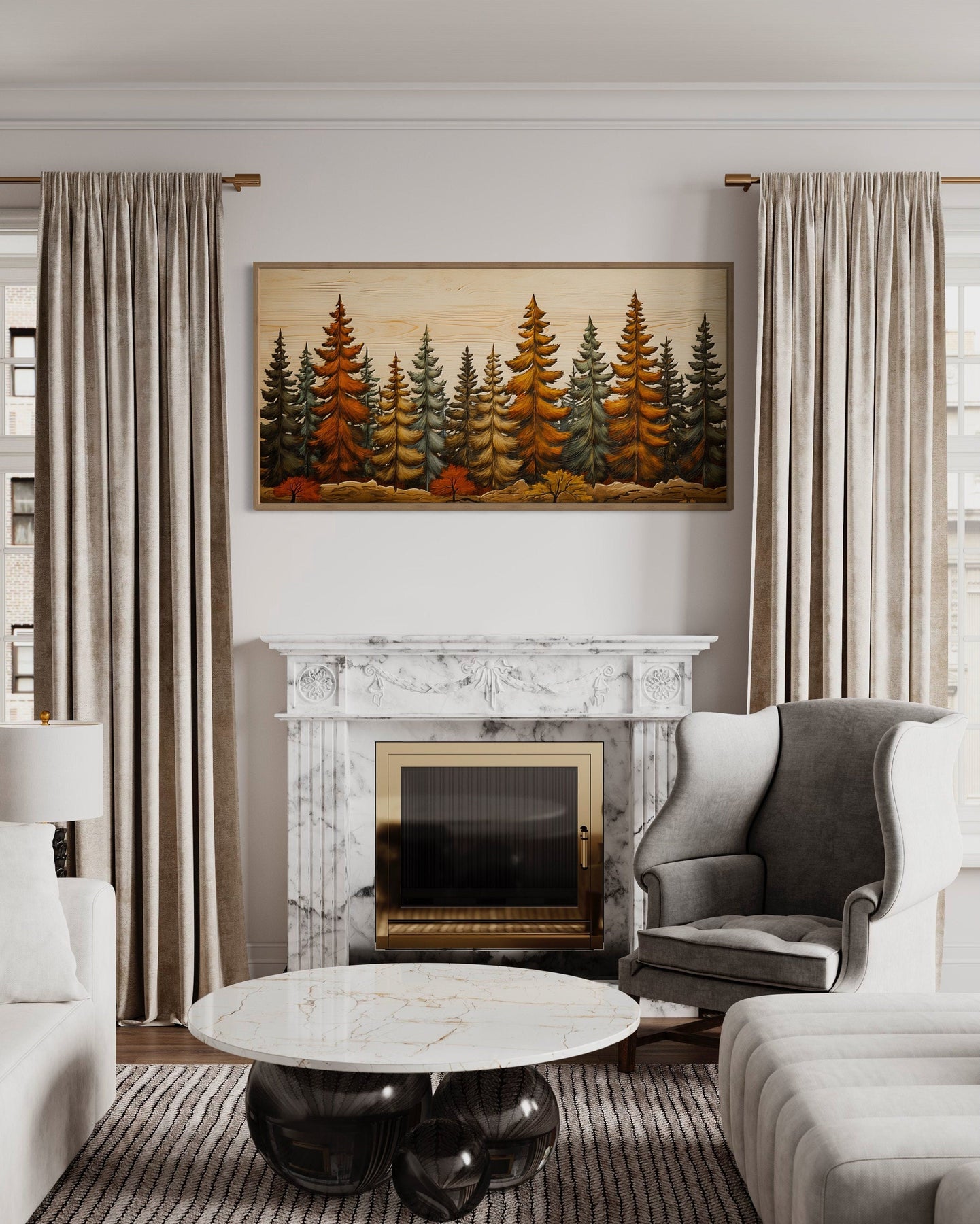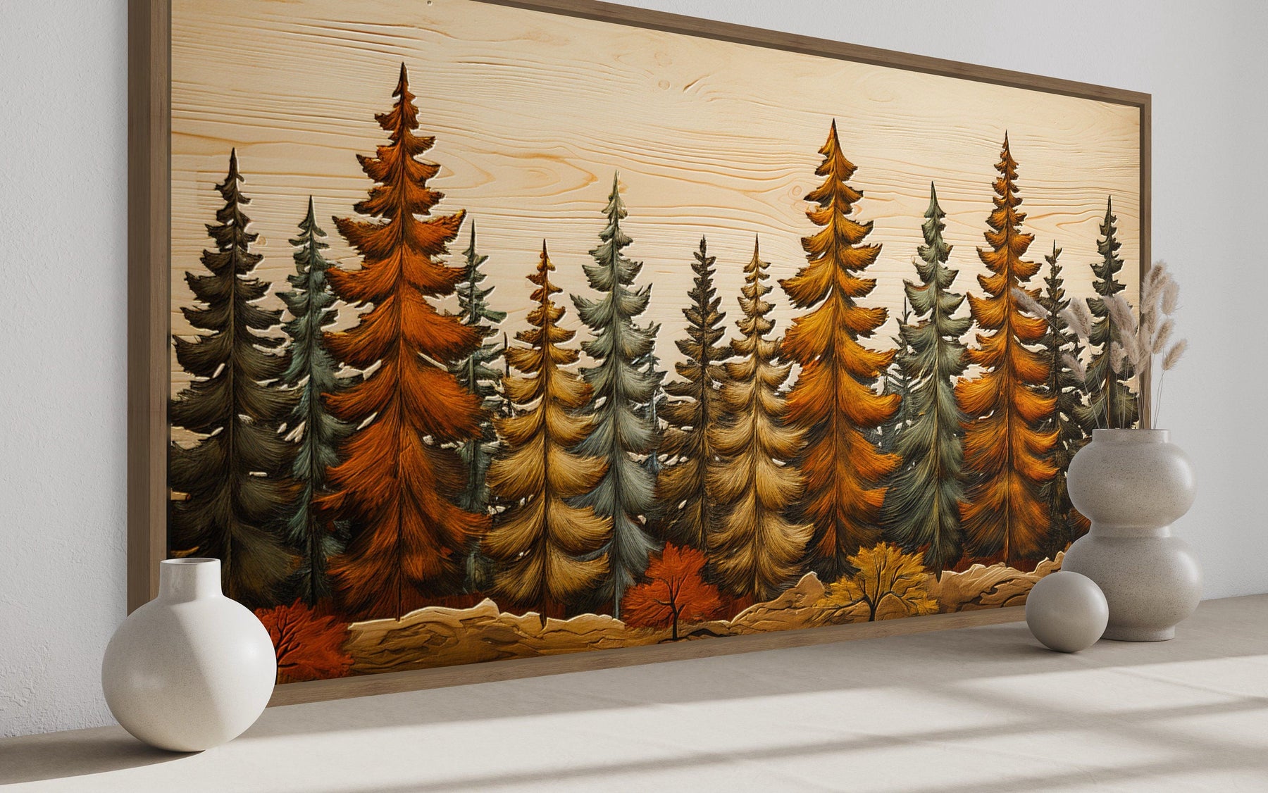 La palette de couleurs de cette peinture de forêt de sapins d'automne est un mélange chaleureux de tons terreux et de riches couleurs d'automne. Les arbres sont représentés dans des tons d'orange foncé, de jaune doré et de brun doux, évoquant la sensation de confort d'une journée d'automne fraîche. Le fond, avec son effet bois, est rendu dans des tons atténués qui rehaussent le dynamisme des arbres sans surcharger la composition. Le mélange harmonieux de couleurs chaudes et neutres rend cette œuvre d'art polyvalente, lui permettant de compléter une large gamme de styles d'intérieur, de la décoration rustique des cabanes aux espaces de vie modernes qui apprécient une touche de nature. Les couleurs de cette œuvre d'art murale de forêt sont parfaites pour créer une atmosphère chaleureuse et accueillante, ce qui en fait un excellent choix pour ceux qui veulent apporter l'essence de l'automne dans leur maison.