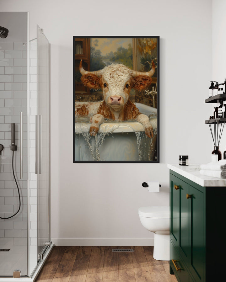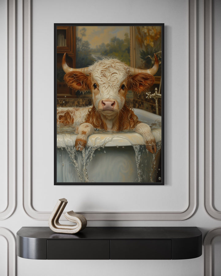 Toile encadrée représentant une petite vache des Highlands dans la baignoire