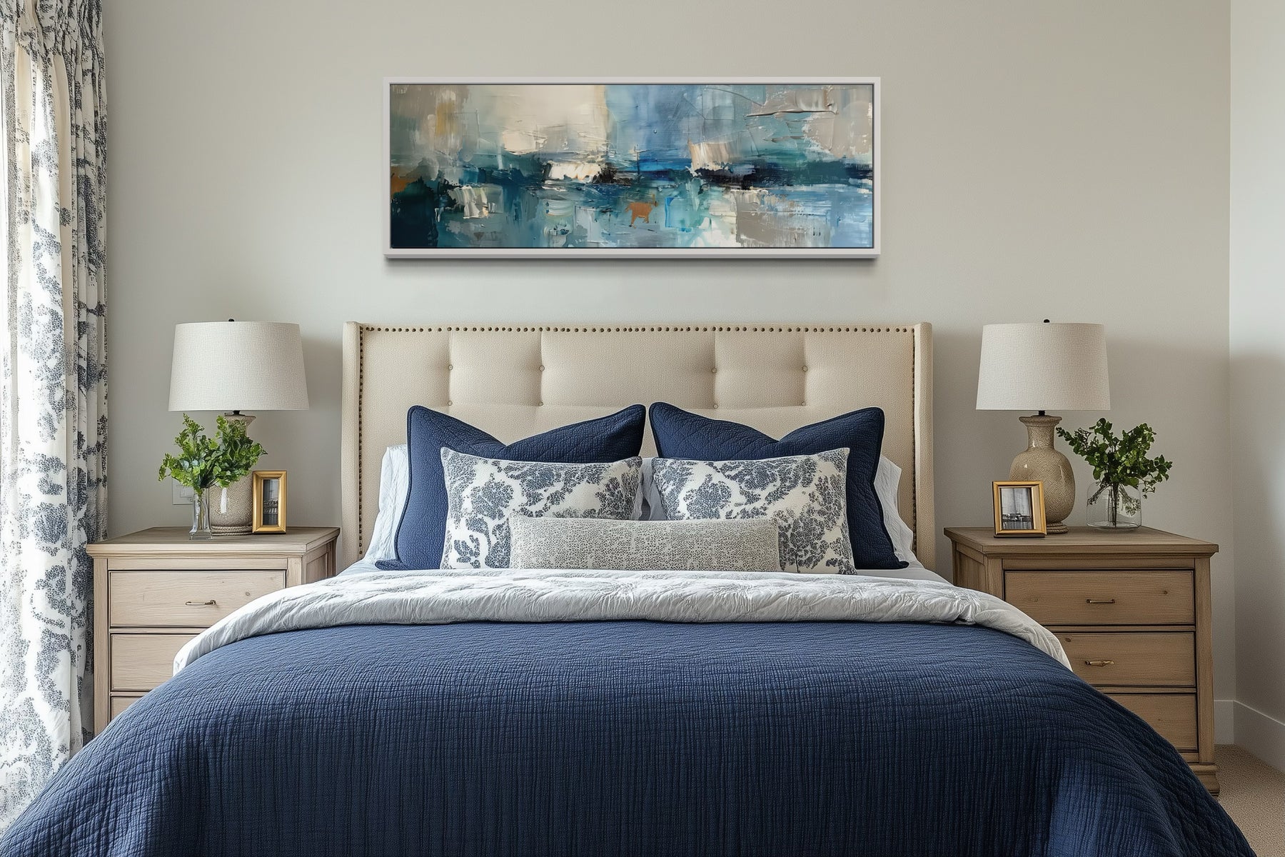 Cette longue toile étroite est un excellent choix pour les chambres modernes, les salons apaisants ou les espaces invités contemporains. Sa palette de couleurs sereines et son design abstrait la rendent particulièrement adaptée au placement au-dessus du lit, où sa disposition allongée améliore la symétrie et l'équilibre de la pièce. Pour les intérieurs d'inspiration côtière, les tons aqua et bleu font parfaitement écho aux couleurs apaisantes de la mer, créant une ambiance relaxante. Les espaces minimalistes bénéficient de ses lignes épurées et de ses teintes douces, ajoutant une touche de chaleur et de profondeur sans surcharger le décor. Il est également idéal pour les retraites de type spa ou les espaces de méditation, offrant un point focal paisible qui favorise la relaxation. Que votre style soit chic côtier, élégance contemporaine ou simplicité moderne, cette décoration murale bleu gris aqua apporte un air de raffinement et de tranquillité à votre maison.