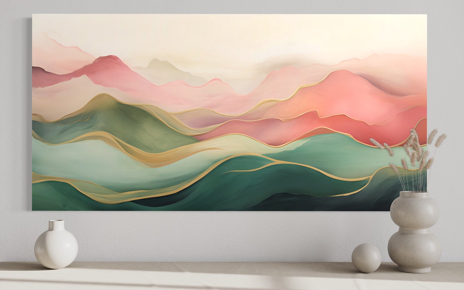La palette de couleurs de cette œuvre d'art murale abstraite de montagne combine des tons rose blush doux et vert frais, créant un effet visuellement apaisant et harmonieux. Les teintes roses chaudes ajoutent une sensation de confort et d'élégance, tandis que les verts rafraîchissants évoquent un lien avec la nature et la tranquillité. Les transitions douces entre ces nuances apportent profondeur et fluidité, améliorant l'esthétique globale. Des accents subtils de crème et de gris clair équilibrent la composition, la rendant adaptable à diverses conditions d'éclairage. Cette palette est idéale pour créer une atmosphère apaisante, que ce soit dans les chambres, les espaces de vie ou les bureaux. Ses tons sobres se marient sans effort avec un mobilier neutre ou peuvent offrir un contraste avec un décor plus sombre. La combinaison de couleurs intemporelle assure la polyvalence, permettant à l'œuvre d'art de mettre en valeur les intérieurs modernes et traditionnels. Laissez cette œuvre d'art murale rose blush et verte apporter une ambiance sereine et élégante à votre espace.