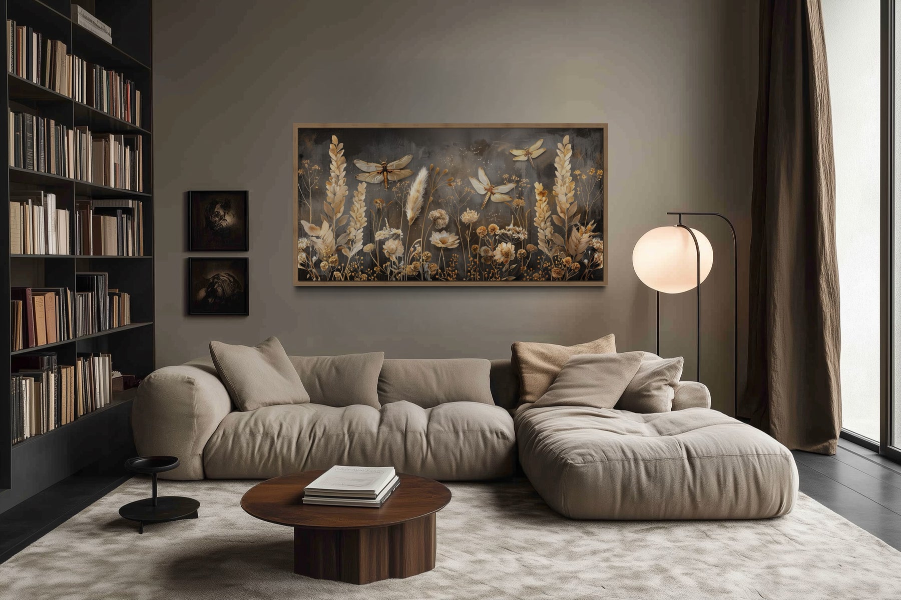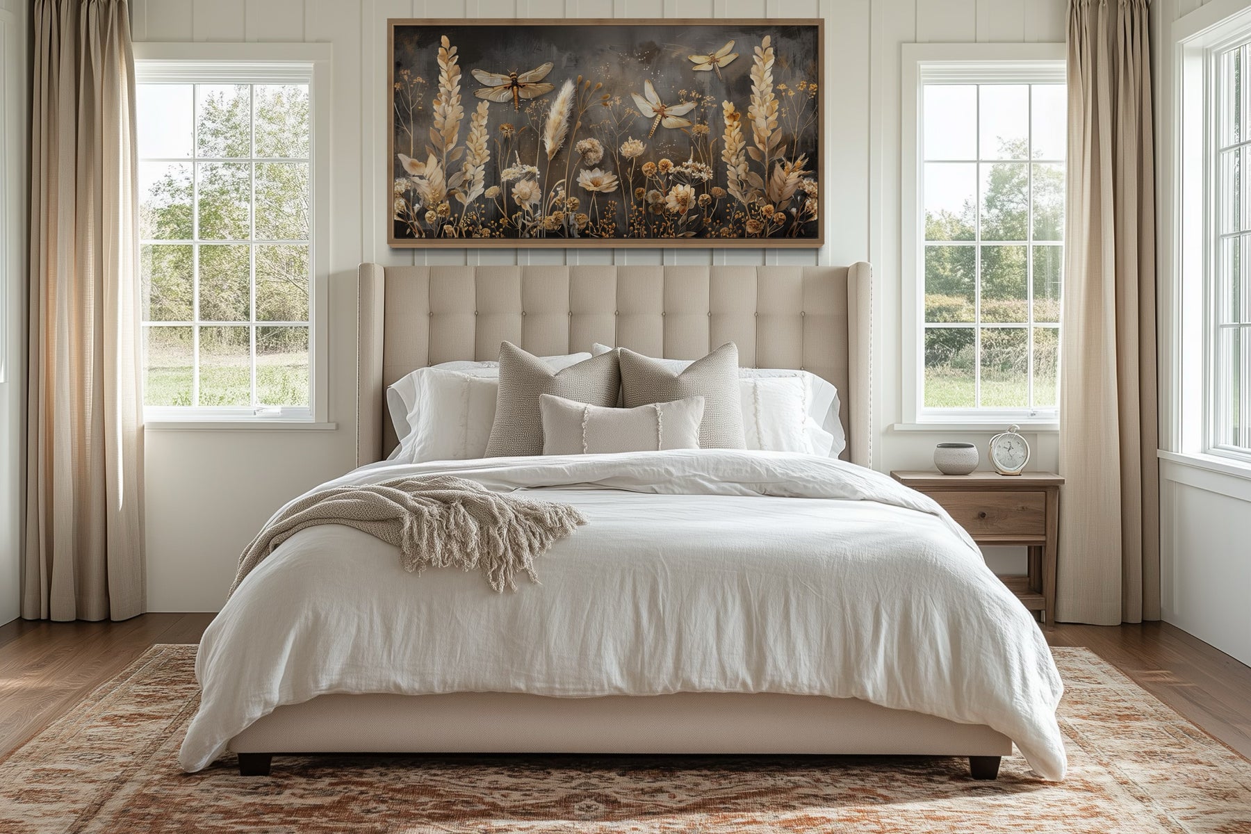 Les teintes marron et beige de cette décoration murale bohème apportent chaleur et harmonie à votre espace, créant une atmosphère ancrée et accueillante. De subtils accents dorés sur les libellules ajoutent des touches d'élégance, attirant l'attention sur leurs détails délicats. Le fond est enrichi de doux dégradés de beige et de crème, apportant profondeur et sophistication à la composition. Les tons terreux de l'herbe confèrent un effet naturel et apaisant qui complète une variété de styles de décoration. La palette discrète garantit que cette décoration murale s'intègre parfaitement dans les espaces clairs et sombres, offrant une option polyvalente pour votre décoration. Cette pièce capture véritablement l'essence de la beauté de la nature, ce qui en fait un ajout idéal aux intérieurs d'inspiration bohème. Avec son mélange harmonieux de tons, cette décoration murale bohème marron beige apporte une esthétique sereine mais élégante à votre maison.