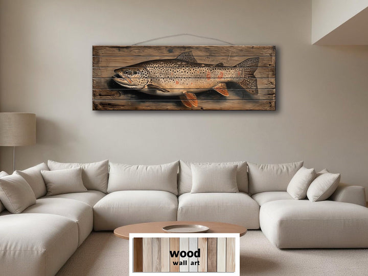 La palette de couleurs de cette œuvre d'art murale en bois vieilli est à la fois naturelle et raffinée, reflétant les tons naturels du poisson et le charme vieilli de la surface du bois. La truite fario est peinte dans un mélange harmonieux de bronze doré, de vert olive et de brun chaud, avec ses mouchetures noires et rouges caractéristiques qui ressortent avec précision. Le ventre passe au crème pâle et au beige doux, créant un contraste subtil qui rappelle les véritables couleurs du poisson. Le fond en bois vieilli présente une gamme de tons naturels – miel chaud, brun clair patiné et noyer profond – qui encadrent le poisson sans le surcharger. De subtils lavis gris et des touches de peinture délavée lui confèrent un aspect vintage authentique, comme si l'œuvre avait passé des décennies dans une cabane au bord du lac. Des ombres plus foncées autour du poisson lui confèrent profondeur et dimension, donnant l'impression qu'il repose juste au-dessus de la surface du bois. L'équilibre général des tons chauds et froids lui permet de s'intégrer harmonieusement aux intérieurs clairs comme sombres. Cette palette naturelle et bien mélangée permet à la peinture de truite brune de se sentir aussi bien à l'aise dans un lodge confortable que dans un espace de vie rustique moderne.