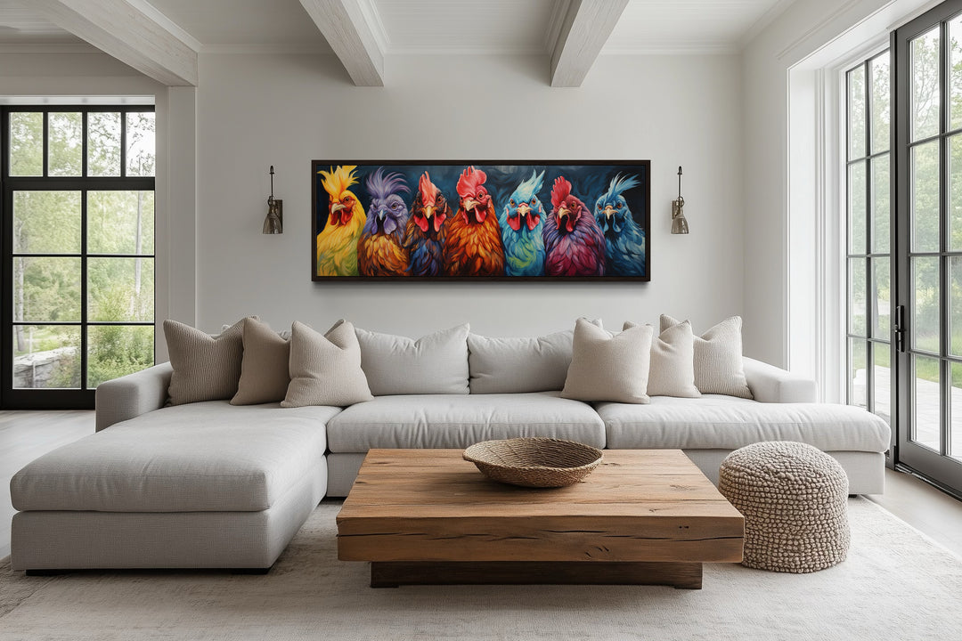 Cette œuvre d'art murale horizontale de style ferme est idéale pour les intérieurs d'inspiration rustique et champêtre. Elle convient parfaitement aux cuisines ou aux salles à manger, où sa composition vivante crée une atmosphère chaleureuse et accueillante. Dans les maisons de style ferme, elle se marie parfaitement avec des meubles en bois, des accessoires vintage et des tons neutres. Pour les espaces modernes, cette œuvre d'art apporte une touche de couleur audacieuse et un élément de charme rural, mêlant tradition et style contemporain. C'est également un excellent choix pour les coins petit-déjeuner confortables ou les cafés à thème de ferme, ajoutant une ambiance joyeuse et authentique. Qu'elle soit exposée au-dessus d'une table à manger ou sur un mur d'accent, cette peinture apporte une touche de plaisir et de personnalité à la pièce. Améliorez votre espace avec le charme ludique et l'énergie vibrante de cette œuvre d'art murale colorée de coqs et de poulets.