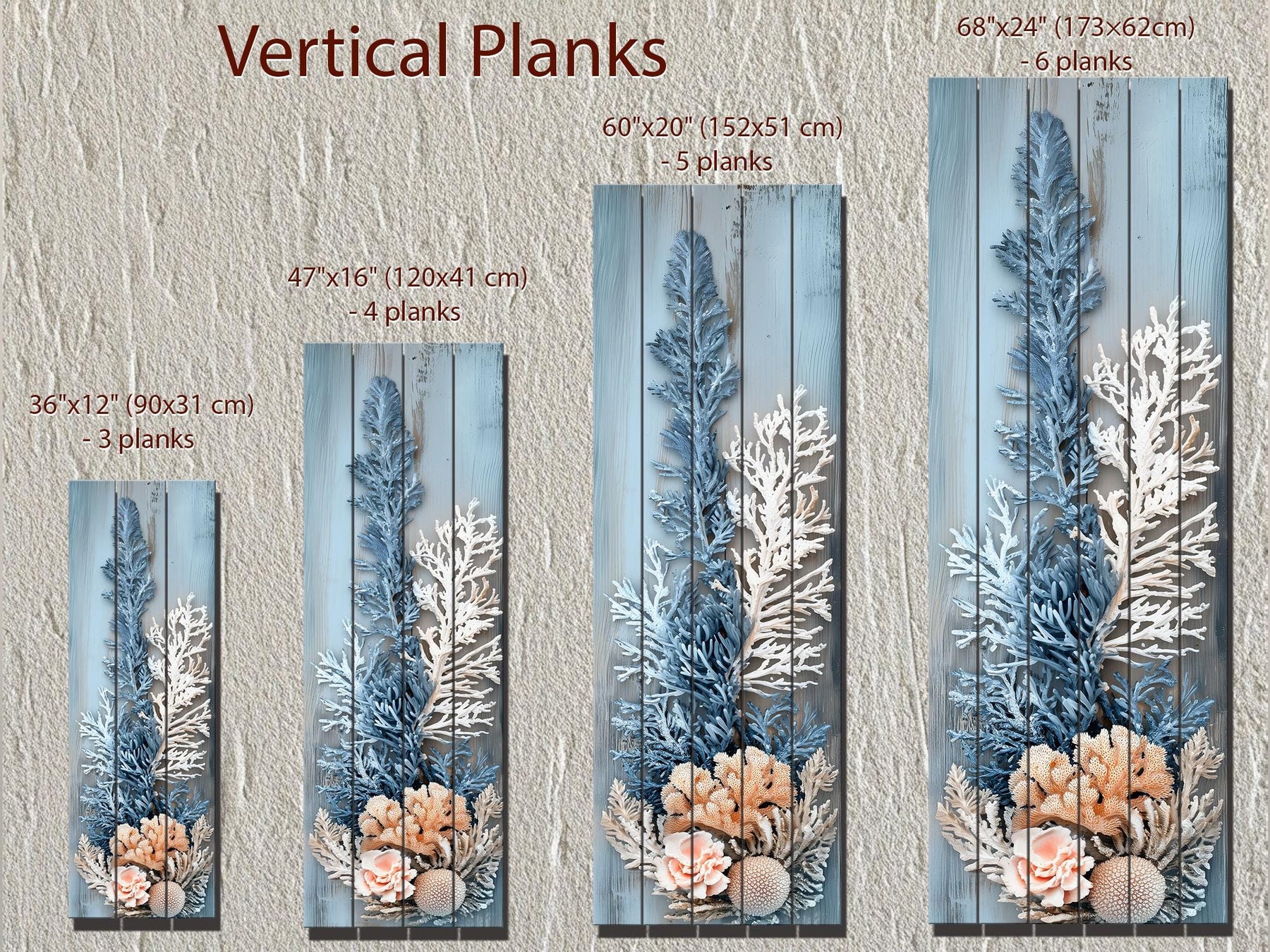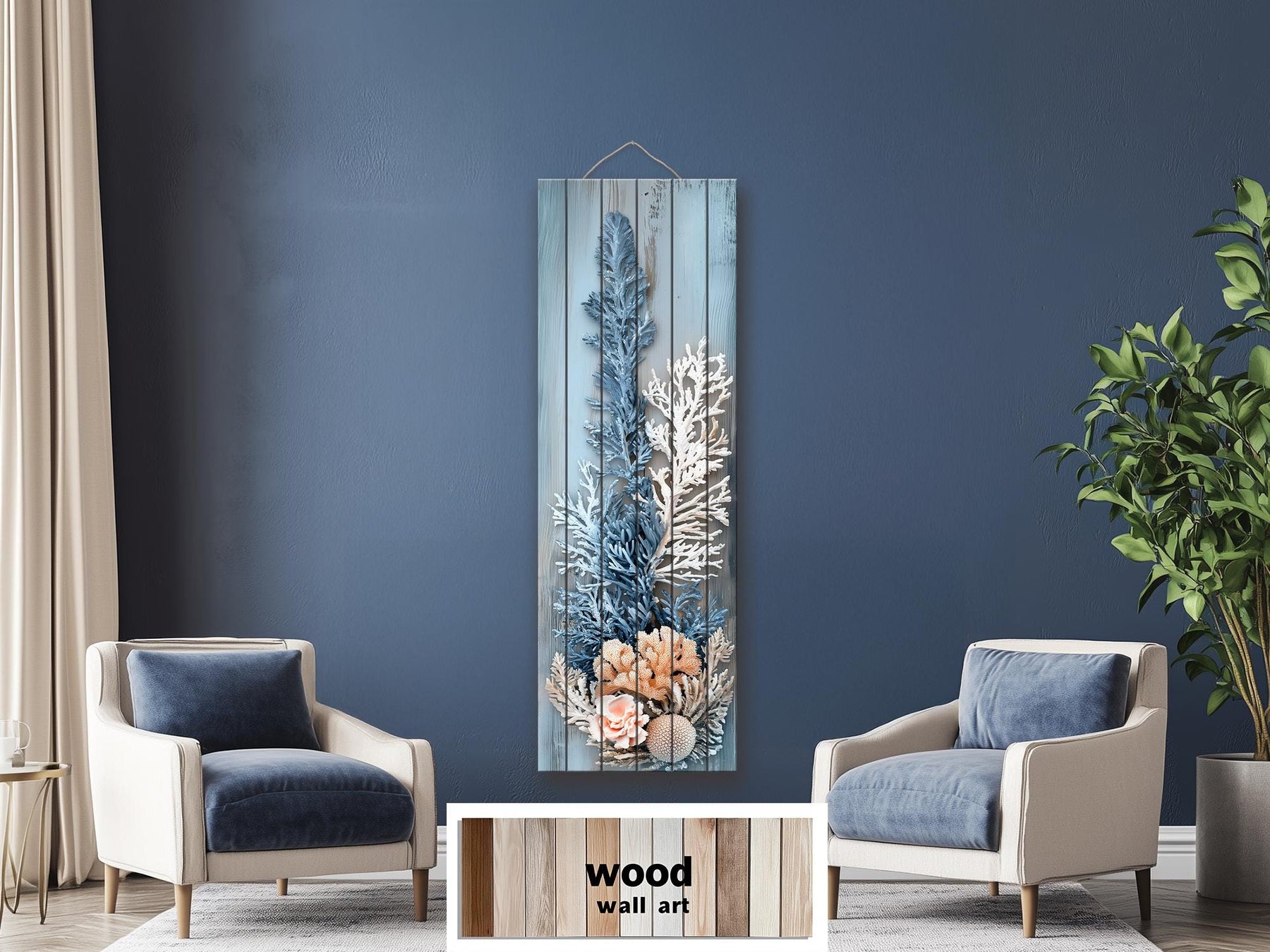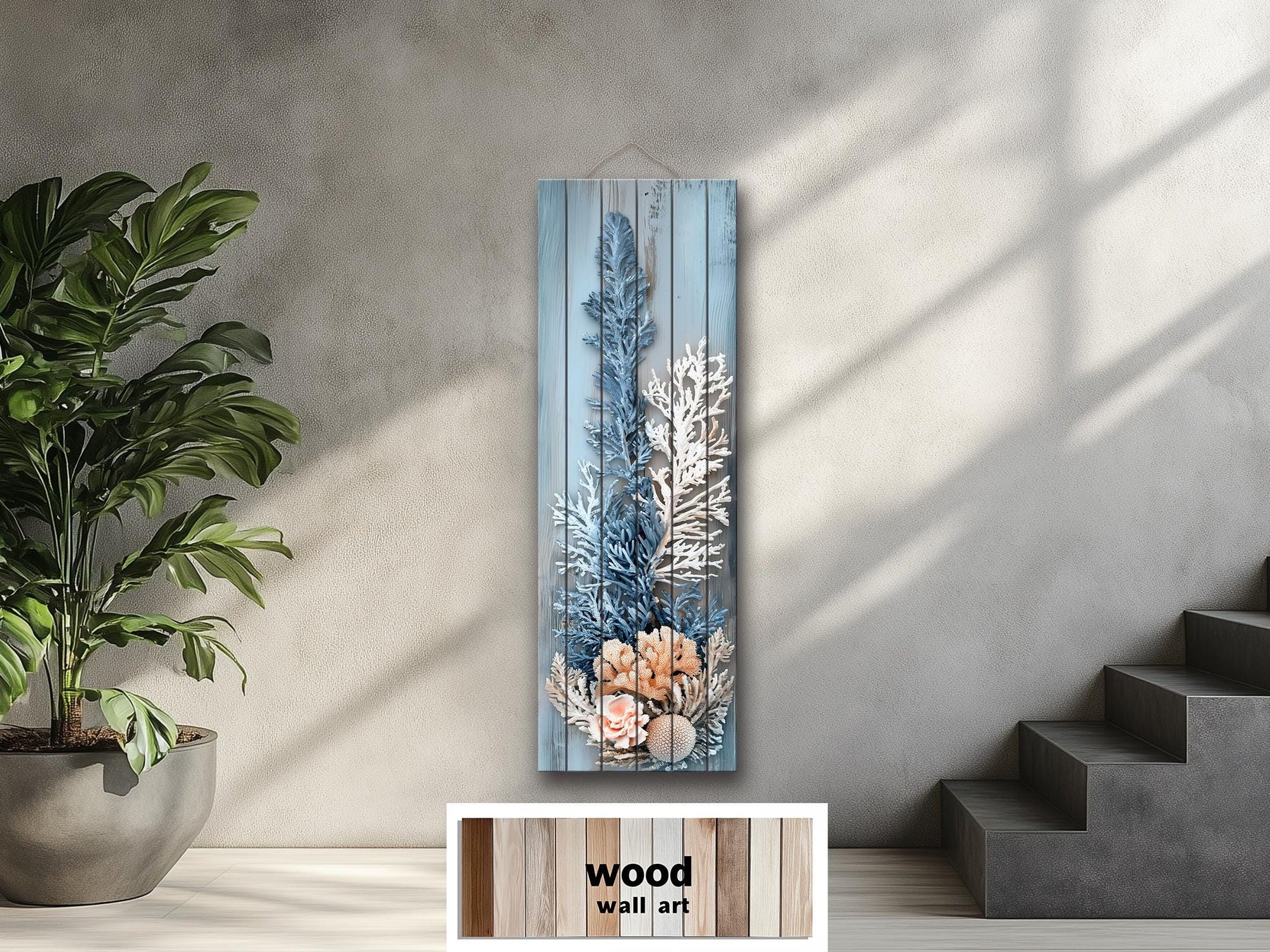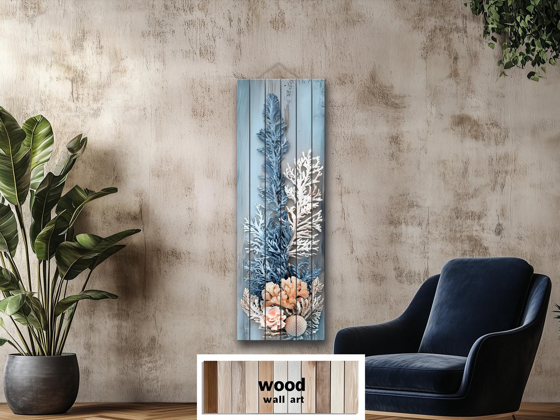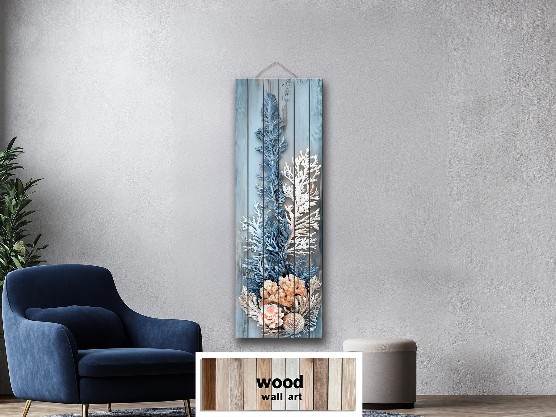 Décoration murale corail – Impression sur bois vieilli, verticale et étroite, aux tons côtiers bleu, blanc et beige