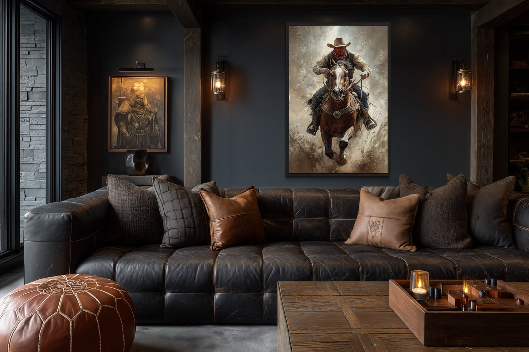 Cette toile murale représentant un cowboy utilise une palette naturelle de bruns poudrés, de bruns terreux et de gris chauds, accentuée par des ombres sombres et des tons de ciel doux. Le manteau et le chapeau du cowboy arborent de riches nuances de chocolat noir et de cuir de selle usé, avec des nuances de rouille qui rappellent le paysage intemporel de l'Ouest américain. Son cheval est peint dans des tons bai profonds, avec des noirs profonds et des tons de terre de Sienne qui parcourent sa crinière, sa musculature et ses mouvements. L'arrière-plan est sobre : un dégradé de beige désaturé à taupe fumé permet au personnage central de se démarquer sans être distrait. De doux tons de ciel nuageux flottent vers le haut du cadre, passant délicatement du cendré au blanc cassé, avec une texture naturelle imitant le lin peint. Ici, pas de teintes artificielles, juste des tons naturels qui ont vieilli avec grâce, comme la poussière sur un jean et le grain du bois sur un mur de saloon. La palette de couleurs est chaleureuse et masculine, parfaite pour les espaces avec du cuir, du bois récupéré ou des éléments en fer forgé foncé. Les détails lumineux de l'équipement du cavalier ajoutent du contraste et de la profondeur à la composition. De haut en bas, cette peinture verticale de cow-boy western offre une palette de chaleur brute et de dignité ombragée.