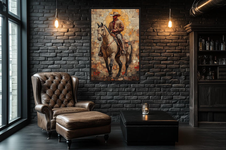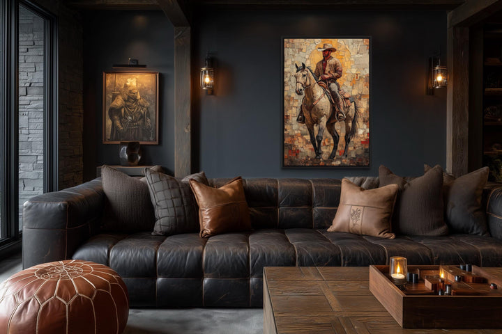Notre toile murale représentant un cowboy présente une représentation verticale audacieuse d'un cowboy à cheval, reproduite dans des tons riches sur une toile texturée. Le cowboy est assis droit sur sa selle, tenant les rênes d'une main et un lasso enroulé de l'autre, vêtu d'une tenue western classique, chapeau à larges bords et bottes. Sa posture est assurée, le visage légèrement incliné vers l'avant, tandis que le cheval sous lui lève une patte avant, donnant à l'image mouvement et présence. Le fond, peint en beige chaud et terre de Sienne texturée, évoque un vieux stuc ou une surface de cuir usé qui soutient la figure sans la contrer. La composition est empilée verticalement, encadrant le cheval et son cavalier de haut en bas, idéal pour les murs étroits ou hauts. Les détails de la musculature du cheval, des vêtements du cowboy et de l'ombre portée en dessous sont finement peints avec un style ample et décontracté, à la fois vieilli et résolu. Les bords de la toile sont nets, enveloppés et sans cadre pour une suspension moderne, digne d'une galerie. Ce tirage ne nécessite ni cadre ni accessoires : il se suffit à lui-même. C’est le style de base de cette peinture de cheval western.