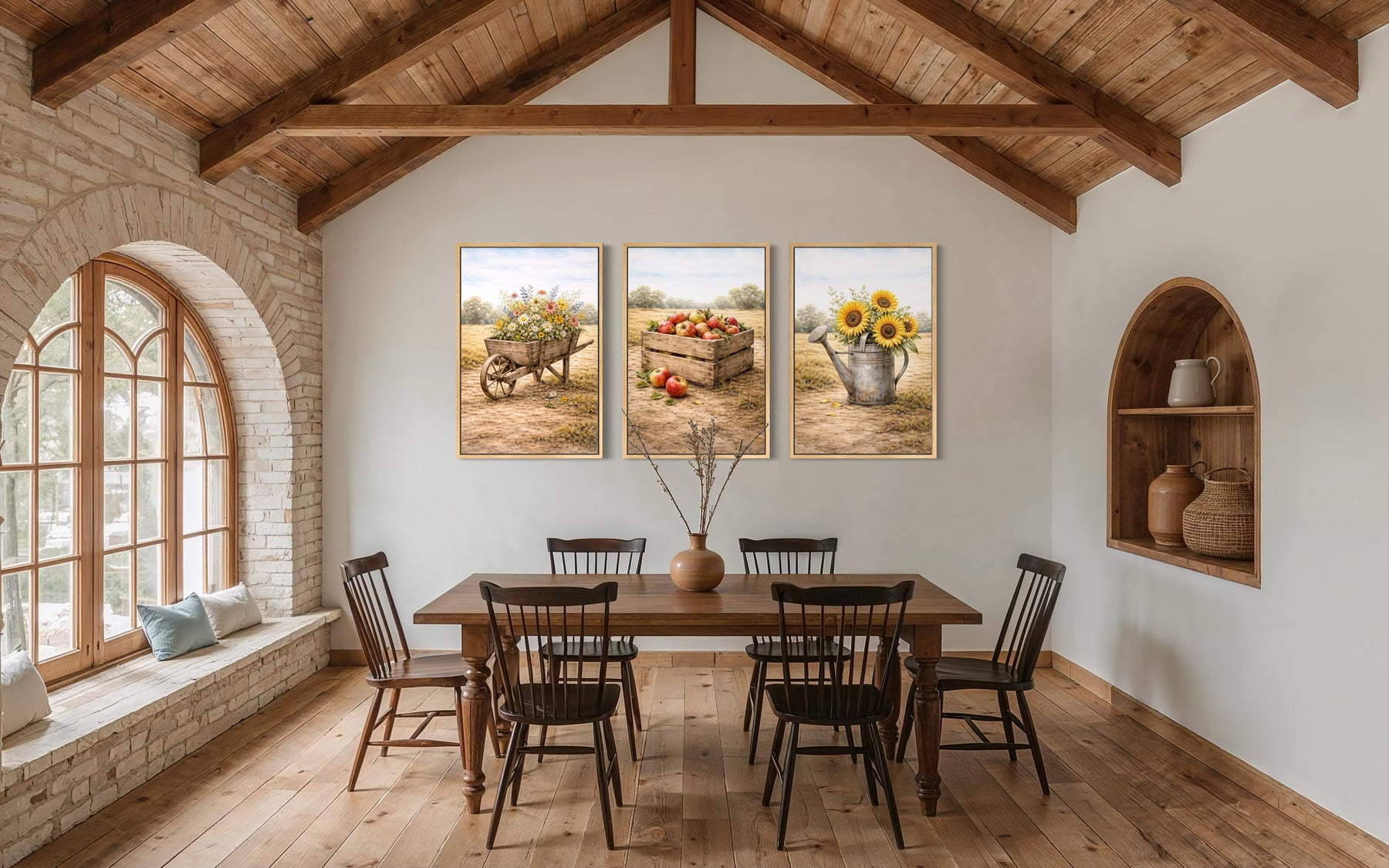Ces impressions sur toile sont parfaites pour les cuisines de style campagnard, les coins repas rustiques ou les salles à manger chaleureuses qui cultivent le charme vintage et le confort d'une maison habitée. Accrochez-les au-dessus d'une table de cuisine en bois, près d'une banquette près d'une fenêtre avec des coussins à carreaux, ou sur un mur orné d'étagères ouvertes et de bocaux anciens. Leurs tons chauds et leurs thèmes de nature morte s'harmonisent à merveille avec des murs en lambris blanchis à la chaux, des meubles patinés et des textiles doux en lin ou en toile de jute. Les maisons qui privilégient une cuisine locale et de saison, les décorations artisanales et les touches artisanales trouveront dans ces impressions un ajout naturel. Dans les espaces avec des éviers de ferme, des poutres apparentes et des tabourets patinés, elles enrichissent l'atmosphère sans l'imposer. La disposition en trois panneaux offre une grande flexibilité de mise en scène : alignez-les, créez une galerie décalée ou répartissez-les dans la cuisine pour une harmonie visuelle. Leur orientation verticale convient également aux petits espaces comme les entrées de cellier ou entre les fenêtres. Que votre maison soit de style cottage rustique ou campagne traditionnelle, ces œuvres d'art s'intègrent naturellement à votre quotidien. Chaque regard posé sur ces estampes évoque la simplicité du terroir, la douce lumière du soleil et les récoltes dorées. Sublimez votre intérieur avec cet ensemble chaleureux et intemporel d'estampes champêtres.