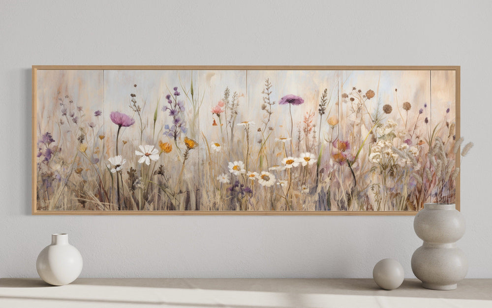 Idéal pour les intérieurs inspirés de la ferme ou les espaces au charme rustique, cette toile murale à fleurs sauvages est le complément parfait aux salons, chambres ou salles à manger confortables. Sa disposition horizontale est particulièrement adaptée au placement au-dessus des têtes de lit, créant un point focal serein dans les chambres principales. Dans un cadre de ferme rustique, il se marie à merveille avec des meubles en bois naturel, des accessoires vintage et du linge de maison discret. Il complète également les espaces modernes en adoucissant les lignes nettes et en ajoutant une touche de chaleur naturelle. Le délicat motif de fleurs sauvages apporte une touche organique à n'importe quelle pièce, ce qui le rend particulièrement adapté à ceux qui aiment la décoration sobre. Cette œuvre d'art brille dans les espaces dédiés à la détente ou à la réflexion tranquille, comme les coins lecture ou les espaces de méditation. Où qu'il soit exposé, l'art mural en toile de champ de fleurs sauvages transforme votre maison en un havre de sérénité.