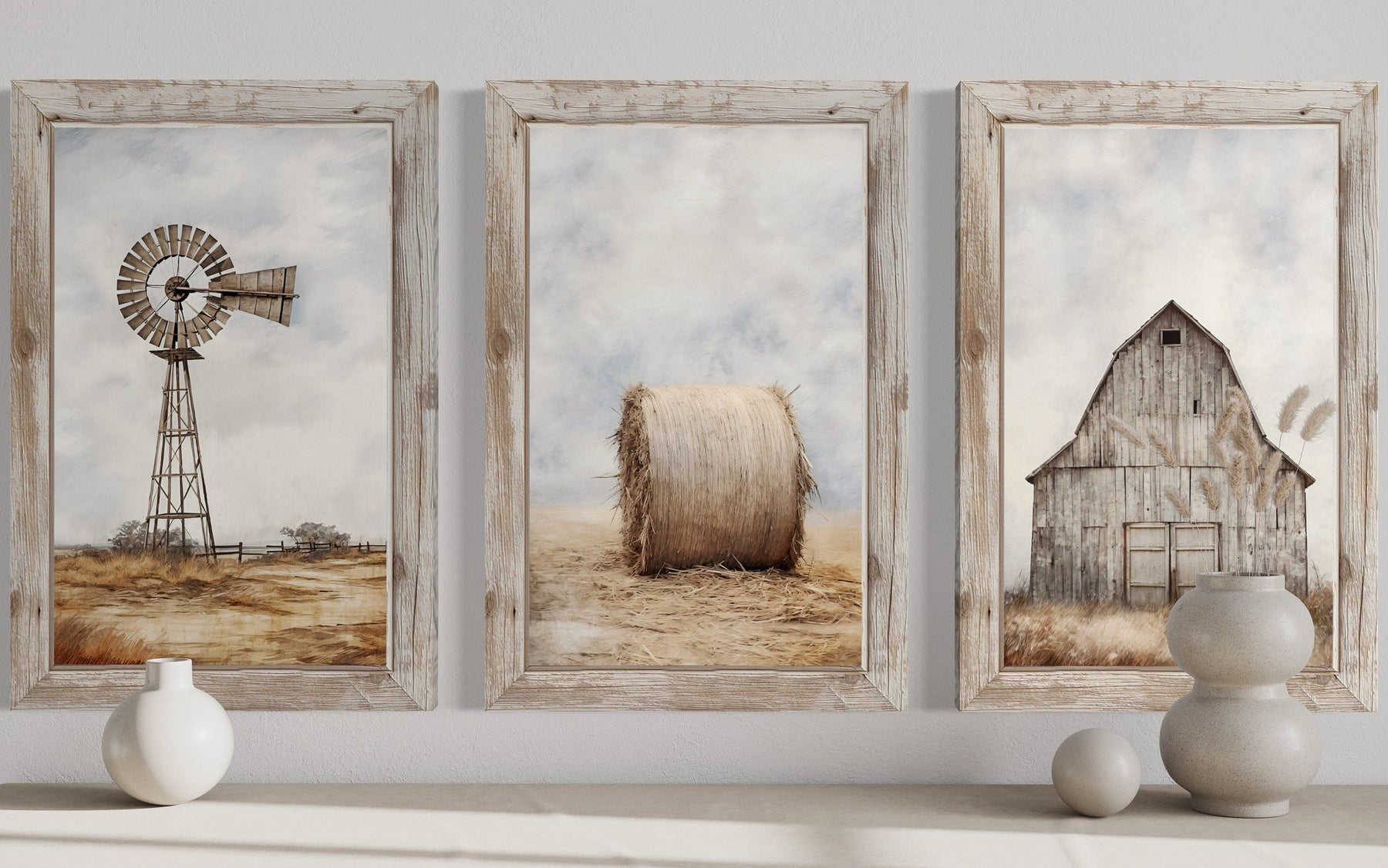 Farmhouse Wall Art - Rustic Farm Prints Set of Three | Barn, Windmill & Hay Bale