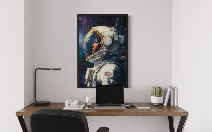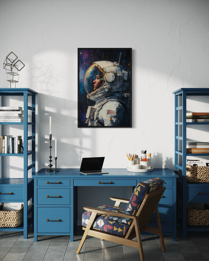 La peinture de l'astronaute féminin présente une palette saisissante qui combine des tons sombres et maussades avec des éclats de couleurs vives. Le fond noir profond contraste magnifiquement avec les blancs et les argents éclatants de la combinaison de l'astronaute, créant un effet visuel spectaculaire. Des accents néon de bleu électrique, de rouge ardent et de jaune radieux apportent de l'énergie et du mouvement à la pièce, tandis que des teintes plus douces de violet et de vert ajoutent une dimension subtile. Le casque réfléchissant présente des dégradés d'or et de turquoise, soulignant encore plus le thème cosmique. Les touches de couleur inspirées des graffitis donnent à l'œuvre d'art une sensation brute et dynamique, renforçant son attrait contemporain. Ce mélange équilibré de tons audacieux et atténués garantit que l'œuvre d'art se démarque tout en restant polyvalente pour différents styles de décoration. Apportez une explosion de couleurs et d'inspiration à votre maison avec cette impression sur toile d'astronaute féminin.