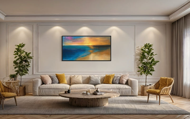 Cette toile abstraite de coucher de soleil sur l'océan aux tons dorés et bleu marine allie élégance moderne et inspiration nautique, ce qui la rend parfaite pour toute pièce à thème marin ou de plage. Les couleurs riches du coucher de soleil, avec des ors vifs et des bleus marine profonds, créent une atmosphère sereine mais dramatique. Cette œuvre d'art encadrée capture la beauté éphémère d'un coucher de soleil sur l'océan, ce qui en fait un merveilleux ajout à tout salon, chambre ou bureau. Le design abstrait offre une interprétation unique de la nature, permettant aux spectateurs de s'engager avec le tableau de manière personnelle. Qu'elle soit utilisée comme point focal dans une maison moderne ou dans le cadre d'un décor nautique, cette pièce ajoute une touche de sophistication. Le format horizontal long le rend idéal pour être accroché au-dessus d'un lit ou d'un canapé. La combinaison des thèmes de l'océan et du coucher de soleil crée une ambiance paisible, parfaite pour la détente.