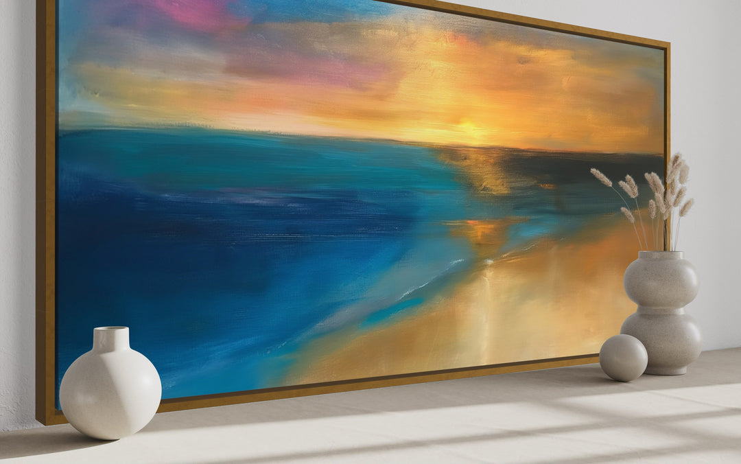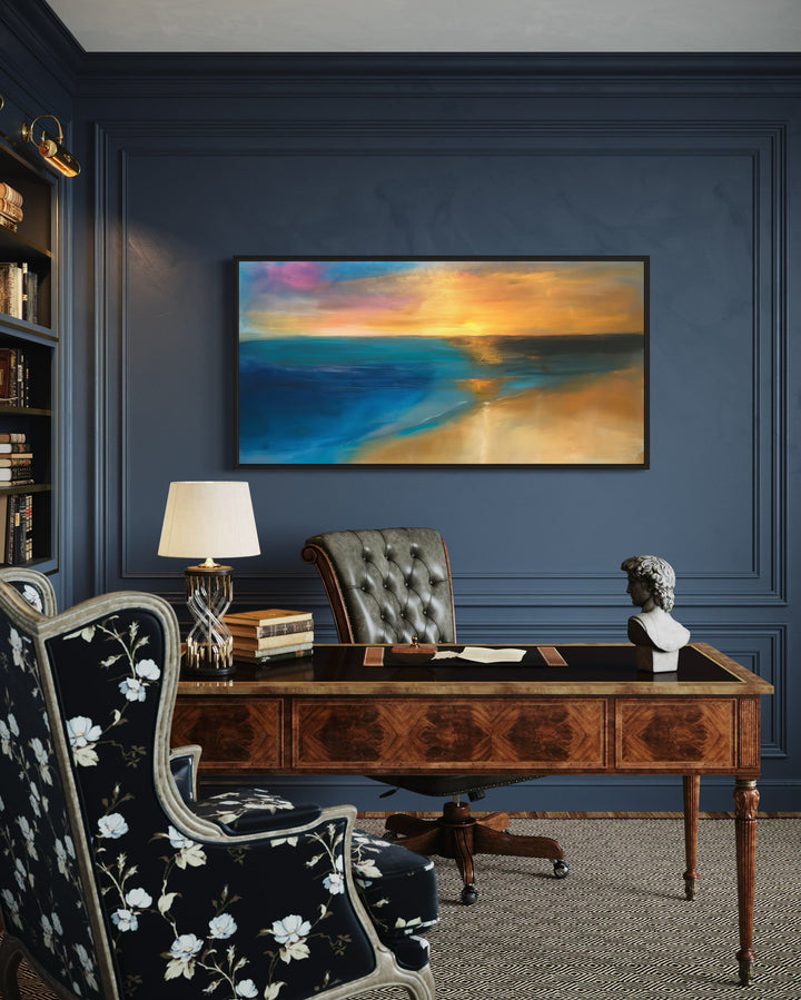 La palette de couleurs de ce tableau abstrait intègre des tons dorés, bleus et roses doux pour imiter la beauté d'un coucher de soleil sur l'océan. Les teintes riches et chaudes de l'or et du jaune se fondent parfaitement dans le bleu marine plus froid, évoquant la transition du jour à la nuit. Ces couleurs fonctionnent à merveille dans une pièce aux tons neutres, ajoutant à la fois chaleur et profondeur à l'espace. Qu'elle soit décorée dans une maison à thème côtier ou dans un cadre plus moderne et minimaliste, les contrastes de couleurs audacieux font ressortir cette œuvre d'art. Les bleus et les ors se marient également bien avec des accents en bois ou métalliques, renforçant l'aspect nautique et contemporain. Le tableau apporte une touche de couleur sans surcharger la pièce, offrant équilibre et harmonie. Le mélange de couleurs vives et douces garantit que cette œuvre d'art murale au coucher du soleil est à la fois vibrante et apaisante.