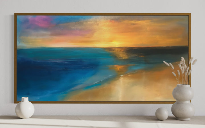 Toile encadrée abstraite bleu marine dorée avec coucher de soleil sur l'océan