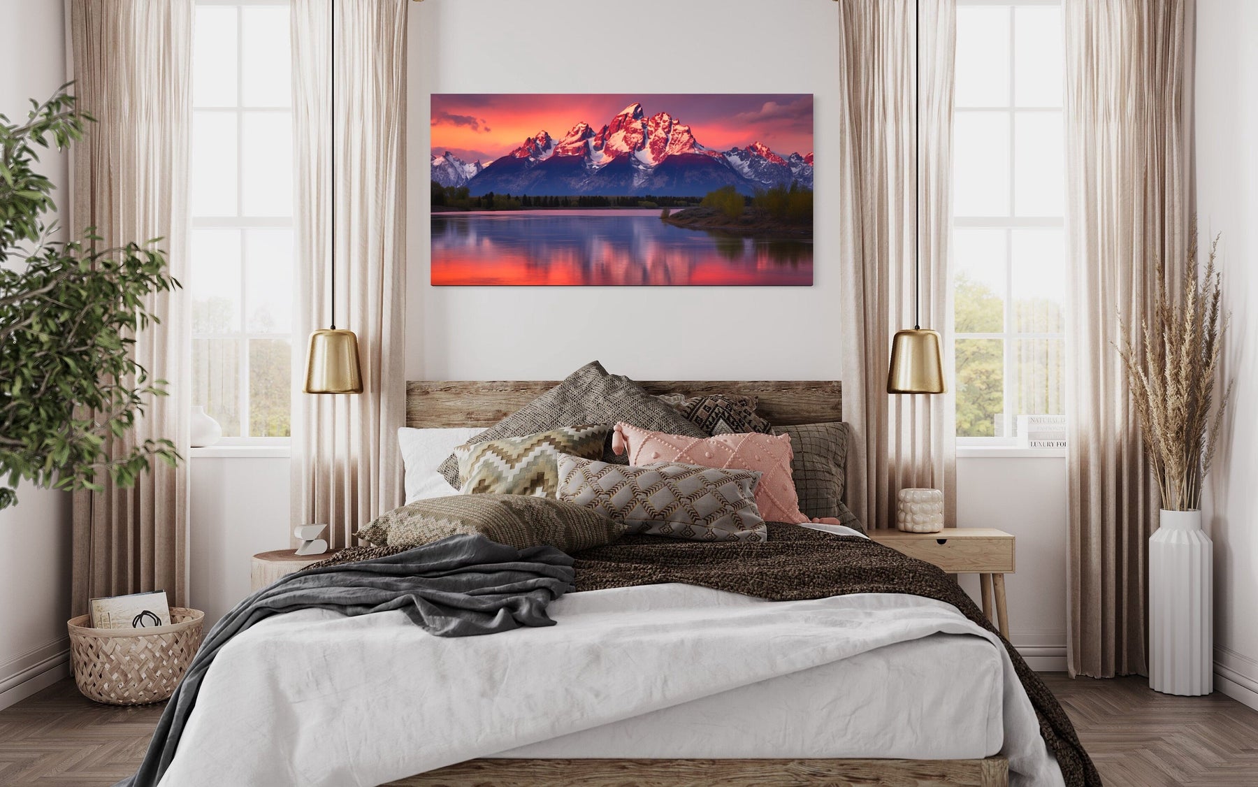La palette de couleurs de cette œuvre d'art murale représentant le paysage du Grand Teton reflète les teintes changeantes du crépuscule. Des lavandes douces et des bleus doux dominent le ciel du soir, créant une toile de fond apaisante pour la scène. Des tons chauds de rose et d'orange illuminent les sommets enneigés, ajoutant de la profondeur et de la chaleur à la composition. La verdure luxuriante de la vallée en contrebas contraste magnifiquement avec les tons plus froids, enracinant l'image dans une splendeur naturelle. Des reflets et des ombres subtils rehaussent les textures de la chaîne de montagnes, donnant à l'œuvre d'art une qualité réaliste. Les couleurs se succèdent de manière transparente, capturant l'atmosphère paisible mais dramatique des Tetons au coucher du soleil. Cette œuvre d'art murale des montagnes Rocheuses du Grand Teton utilise sa palette de couleurs vibrantes et équilibrées pour célébrer la beauté de la nature.
