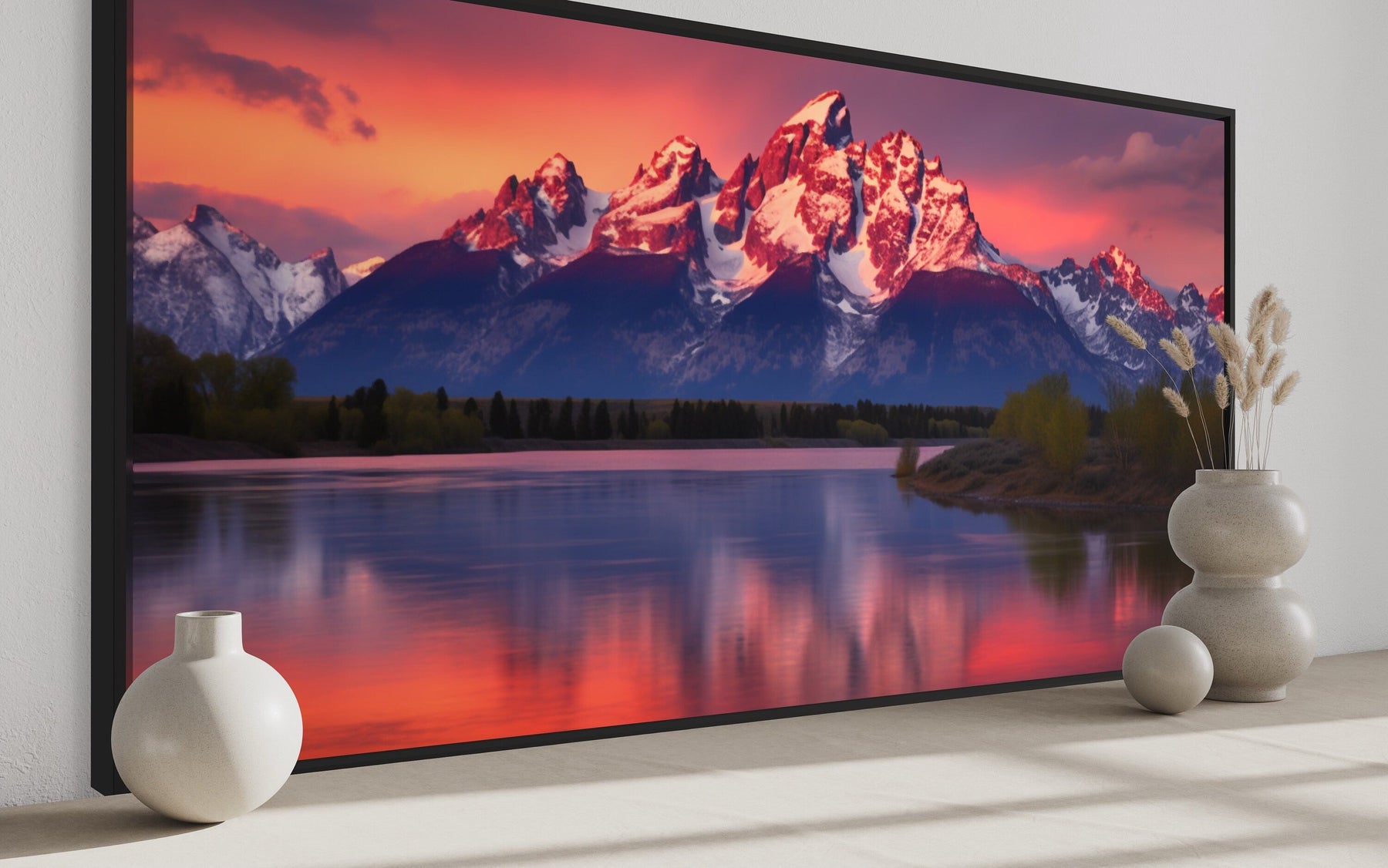 Notre œuvre d'art murale Grand Teton Rocky Mountains capture magnifiquement la majesté de cette chaîne de montagnes emblématique au crépuscule. L'œuvre d'art représente les sommets accidentés des Tetons, baignés dans la douce lumière d'un coucher de soleil qui s'estompe, avec des roses et des violets vifs se fondant dans le ciel serein du soir. Les sommets enneigés contrastent avec la vallée luxuriante en contrebas, créant une composition harmonieuse qui semble à la fois tranquille et puissante. Cette œuvre d'art sur toile encadrée apporte la splendeur naturelle des montagnes Rocheuses dans votre espace, célébrant la beauté tranquille de la nature sauvage. Les textures détaillées du terrain rocheux et les dégradés doux du ciel évoquent un sentiment de calme et d'émerveillement. Parfaitement encadrée, cette pièce allie grandeur naturelle et élégance artistique, ce qui en fait un point focal époustouflant pour n'importe quelle pièce. Élevez votre espace avec le charme intemporel de cette œuvre d'art murale Grand Teton Rocky Mountains.