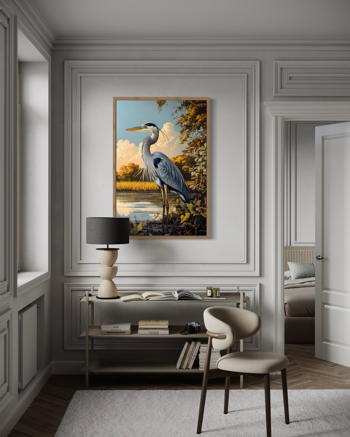 La palette de couleurs de cette décoration murale représentant un grand héron bleu est une combinaison magistrale de tons froids et terreux. Des nuances de bleu ardoise profond et de gris doux dominent les plumes du héron, lui donnant une apparence réaliste et majestueuse. Celles-ci sont parfaitement complétées par les verts et les bruns atténués des roseaux et des marais. La douce lueur du ciel introduit des teintes douces de crème et de bleu pâle, renforçant le calme général de la scène. De subtils accents de jaune doré sur le bec du héron et des reflets sur l'eau ajoutent chaleur et profondeur à la composition. La surface réfléchissante du marais reflète les couleurs délicates, créant un équilibre harmonieux qui apaise l'œil. Cette peinture d'oiseaux des zones humides se marie à merveille avec les intérieurs neutres ou terreux, offrant à la fois polyvalence et style. Sa palette soigneusement choisie garantit que cette œuvre d'art enrichira votre espace avec ses teintes apaisantes et sophistiquées.