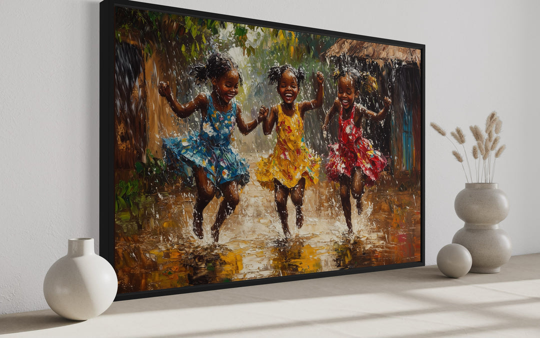 Toile encadrée représentant des filles africaines joyeuses dansant sous la pluie