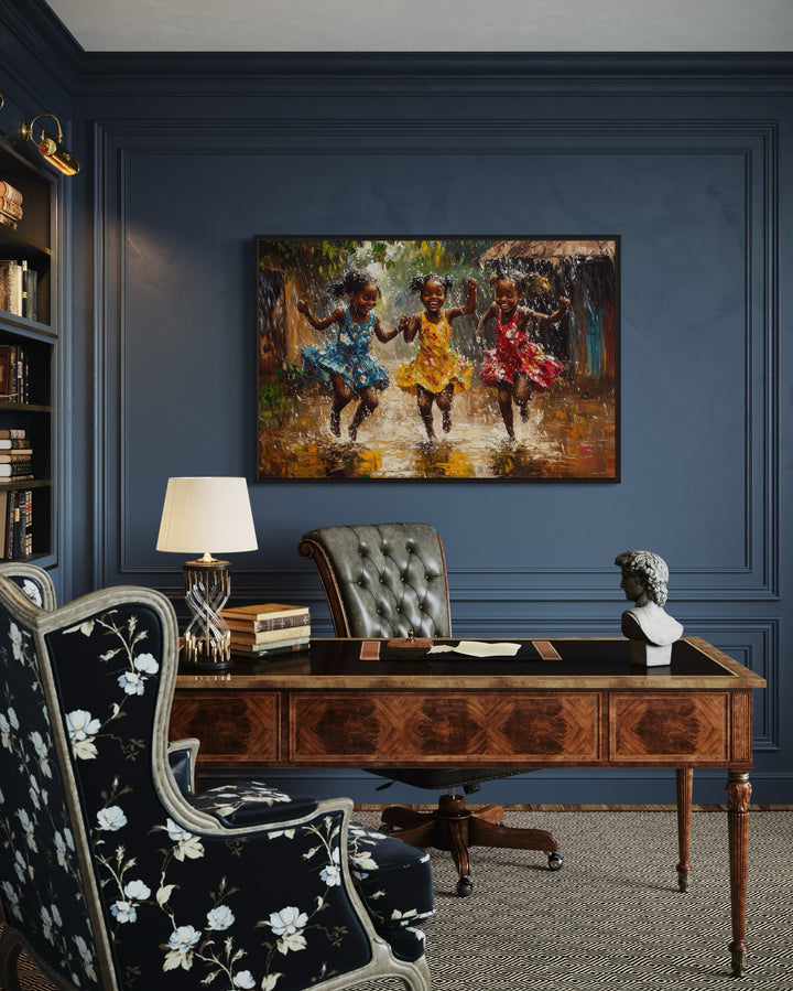 Cette toile encadrée est un choix idéal pour les amateurs d'œuvres d'art culturelles et expressives. Parfaite pour un salon, elle constitue un point focal qui apporte chaleur et vie à l'espace. Elle s'intègre également parfaitement dans un intérieur bohème ou éclectique, où son mouvement vibrant et sa riche narration seront pleinement appréciés. Ce tableau est un excellent ajout à une salle de jeux ou une chambre d'enfant, inspirant un sentiment de joie, d'imagination et de liberté. Les amateurs de décoration afrocentrique y trouveront une représentation significative du bonheur et de la tradition, ajoutant profondeur et émotion à leur collection. Dans un intérieur moderne, elle contraste harmonieusement avec les murs neutres, apportant une touche vivante et colorée. Qu'elle soit exposée dans un espace familial, un coin lecture cosy ou un atelier d'artiste, elle sublime l'atmosphère par sa positivité et son mouvement. Conçue pour célébrer la culture et l'enfance, cette décoration murale représentant des jeunes filles africaines dansant sous la pluie est un ajout magnifique et significatif à tout intérieur.