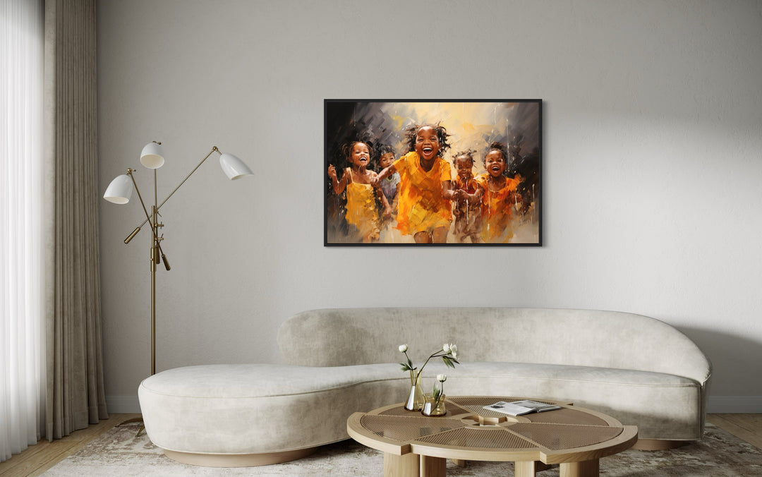 Cette toile représentant des enfants africains heureux en train de jouer présente une palette rayonnante dominée par des tons chauds comme des oranges vibrants, des jaunes et des bruns terreux. Ces couleurs évoquent la chaleur du soleil africain et renforcent l'atmosphère animée de la scène. De subtiles touches de vert et de bleu ajoutent du contraste et de l'équilibre, rendant la composition encore plus dynamique. Le mélange harmonieux de tons chauds et froids crée une ambiance accueillante et joyeuse. Chaque teinte est judicieusement placée pour mettre en valeur la joie et l'énergie des enfants, attirant l'œil sur leurs interactions ludiques. Les couleurs riches complètent à la fois les intérieurs neutres et audacieux, ajoutant de la polyvalence au placement de l'œuvre d'art. Qu'elle soit associée à des meubles en bois ou à des accents modernes, la palette de couleurs garantit que la pièce se démarque. Cette toile murale pour enfants africains heureux apporte une infusion de chaleur et de vitalité à n'importe quel espace.