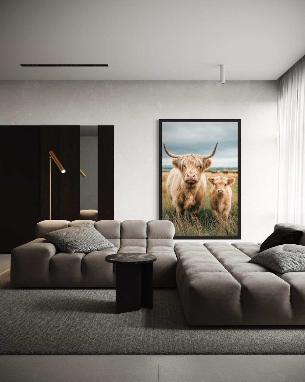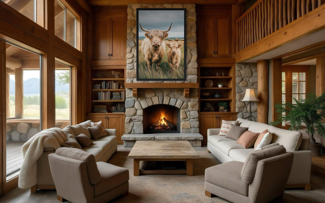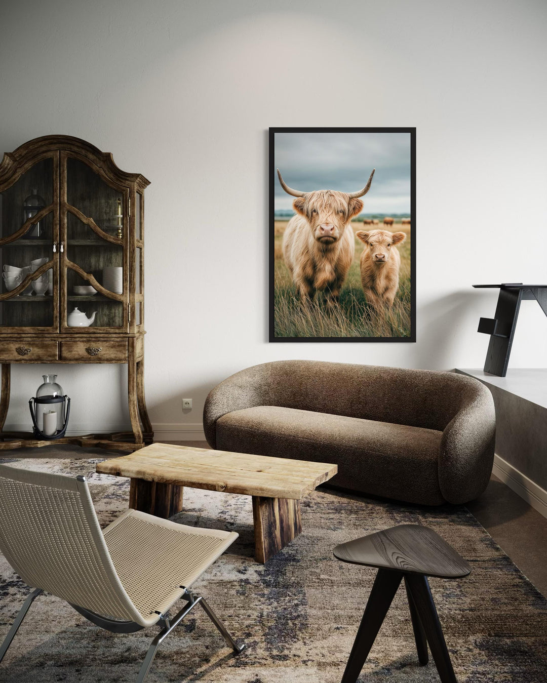 Cette œuvre d'art convient parfaitement aux intérieurs qui célèbrent le charme rustique, la chaleur d'une ferme ou l'élégance d'une campagne moderne. Dans une cuisine ou une salle à manger rustique, elle s'associe parfaitement à des meubles en bois récupéré, du linge de maison neutre et des touches de métal vintage, créant une atmosphère chaleureuse. Dans un salon, elle s'intègre parfaitement au-dessus d'une cheminée, d'un canapé ou d'une console, surtout associée à des tissus texturés et à des tons neutres superposés. Dans les espaces rustiques modernes, l'image apporte chaleur et texture naturelles, équilibrant surfaces épurées et authenticité de la vie rurale. Elle convient également parfaitement aux chambres, où sa douceur et son thème pastoral créent une atmosphère apaisante. Les entrées bénéficient de sa présence forte et digne, accueillant les invités avec une œuvre à la fois conviviale et raffinée. Son format vertical lui permet de s'intégrer harmonieusement aux murs plus étroits sans compromettre son impact visuel. Qu'elle soit accrochée seule comme pièce maîtresse ou intégrée à une galerie murale, cette œuvre d'art murale inspirée de la photographie de vaches et de veaux des Highlands apporte une touche des Highlands à votre intérieur avec grâce et authenticité.