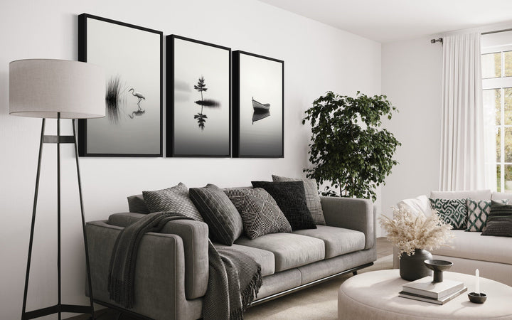 La palette de couleurs de cet ensemble d'art mural Japandi est un équilibre sophistiqué de tons noirs, blancs et gris doux. Ces teintes neutres créent un effet apaisant, permettant aux contrastes subtils entre le lac brumeux, la grue et le bateau de se démarquer. La composition en niveaux de gris met en valeur les textures et les détails délicats, tels que l'eau ondulante et les fines branches de l'érable. L'interaction de la lumière et de l'ombre ajoute de la profondeur, mettant en valeur le design minimaliste global. L'absence de couleurs vives concentre l'attention sur les qualités sereines et méditatives de l'œuvre d'art. Cette palette monochrome complète un large éventail de styles d'intérieur, en particulier ceux à l'esthétique neutre, minimaliste ou moderne. Les dégradés subtils de gris et de blanc créent une ambiance tranquille et équilibrée. Insufflez à votre espace sophistication et calme grâce aux tons élégants de cet art mural Japandi.