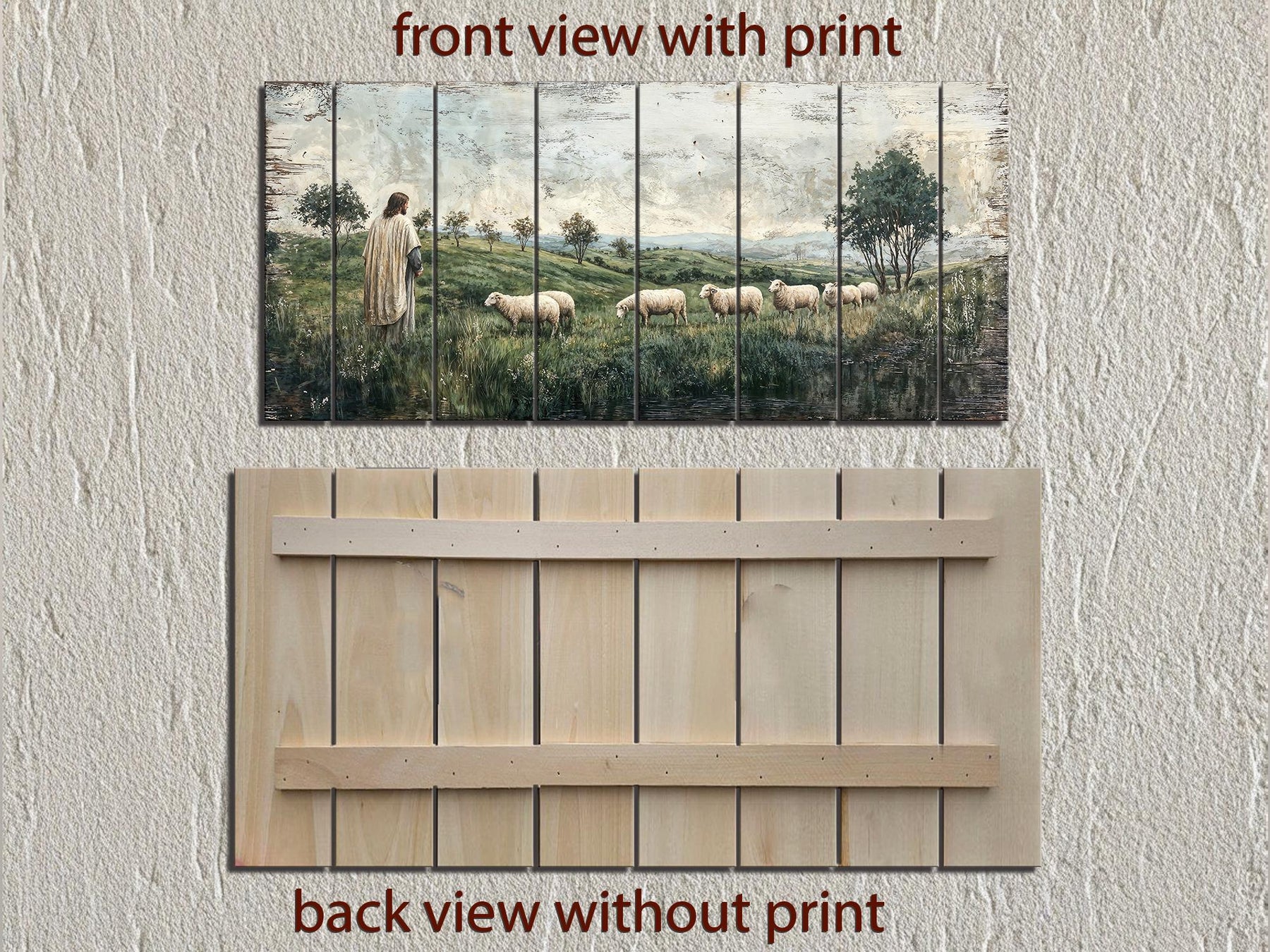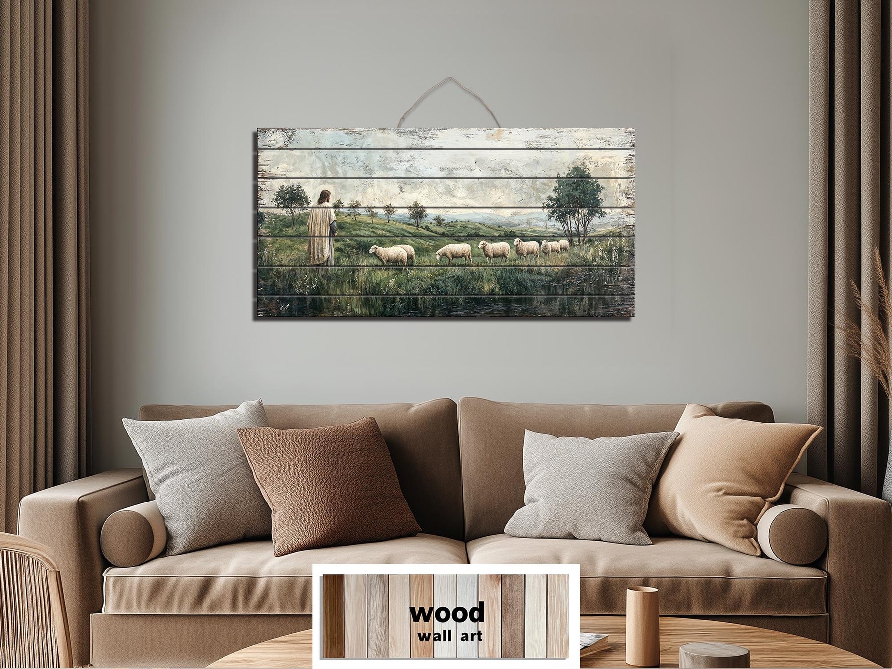 La palette de cette décoration murale en bois vieilli représentant Jésus et ses moutons se compose de verts naturels doux, de tons chauds et de nuances neutres de ciel, créant un équilibre visuel apaisant et réconfortant. Des champs aux teintes douces de sauge et d'olivier forment la base du paysage, tandis que des chemins beige sable guident le regard. Les moutons apparaissent dans des tons blancs crémeux et gris clair qui se détachent délicatement sans rompre l'harmonie. La robe de Jésus arbore des tons neutres et chauds qui se fondent naturellement dans l'environnement et soulignent l'humilité et la paix. Des nuances de bleu délavé et de ciel pâle apportent lumière et ouverture à l'horizon. Le grain du bois visible sous l'impression vieillie laisse transparaître des nuances de miel et de chêne clair, ajoutant une chaleur organique et rendant chaque panneau légèrement unique. Des bords légèrement usés et des détails de peinture adoucis accentuent le caractère vintage et empreint de dévotion. Les couleurs restent volontairement discrètes pour que l'œuvre d'art paraisse intemporelle plutôt qu'audacieuse. L'équilibre entre les tons chauds du sol et les nuances froides du ciel confère à la pièce une atmosphère visuellement apaisante. Cette palette naturelle donne à cette décoration murale en bois vieilli représentant Jésus et ses moutons une atmosphère chrétienne sereine.