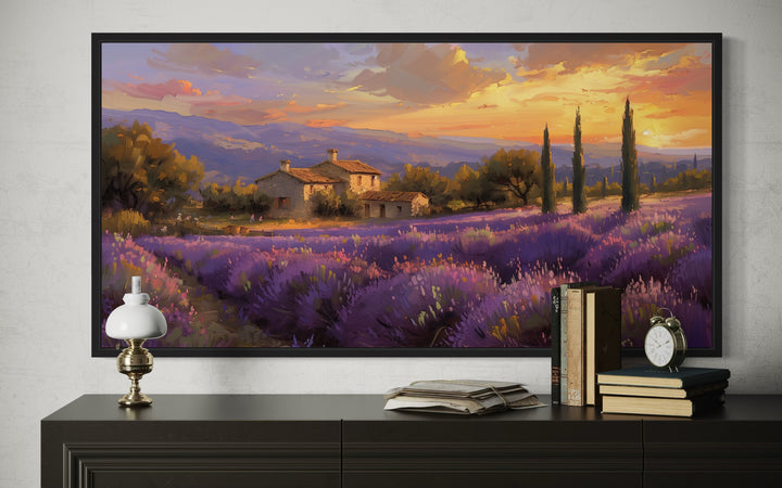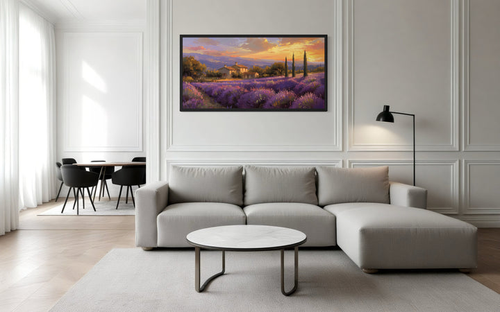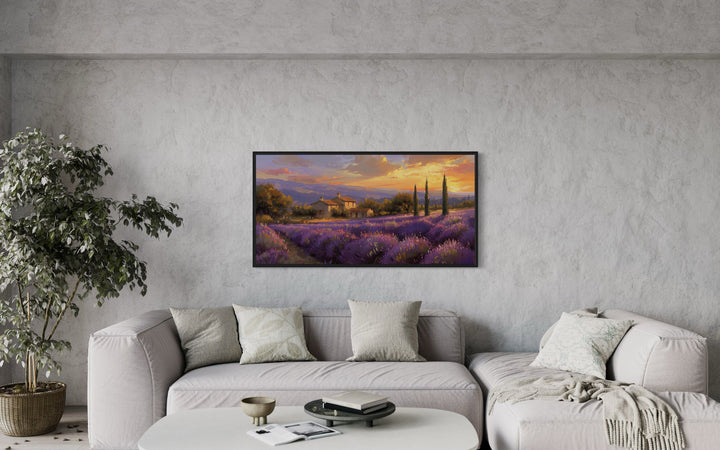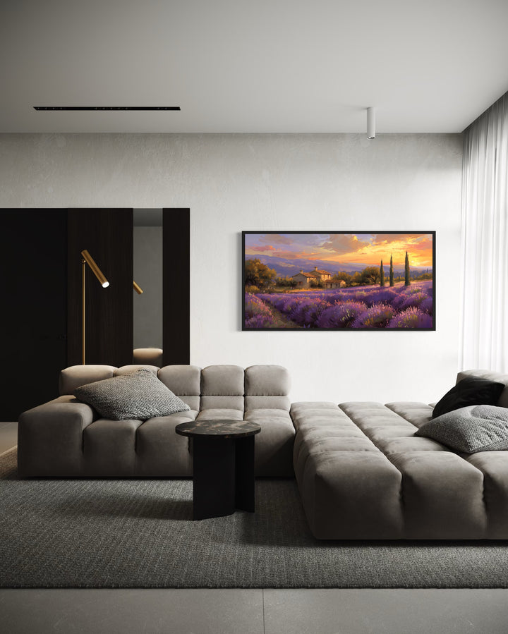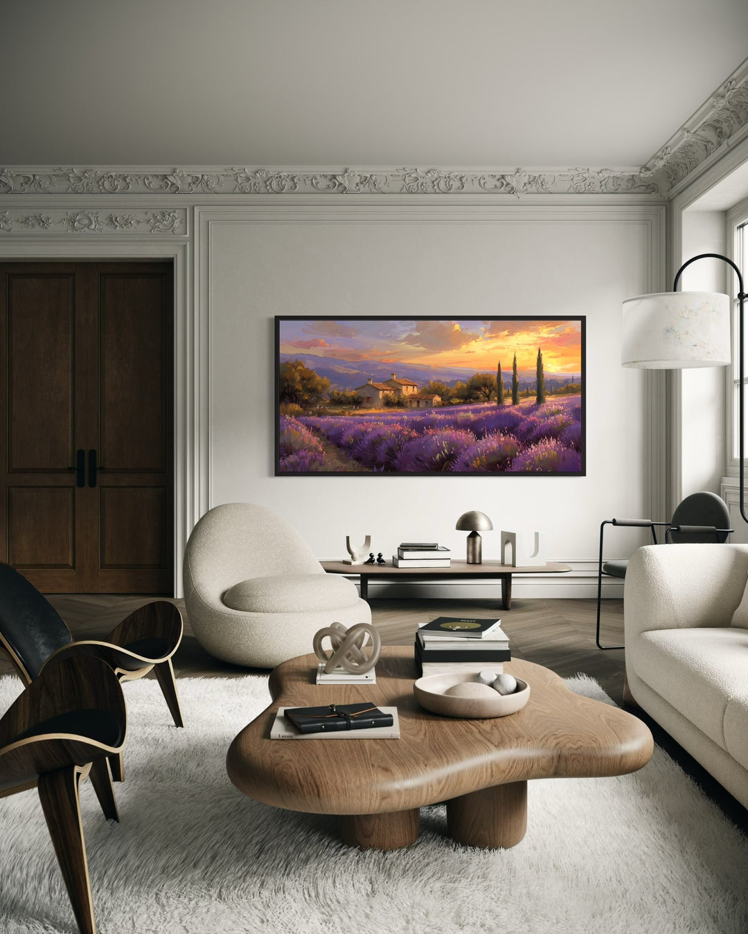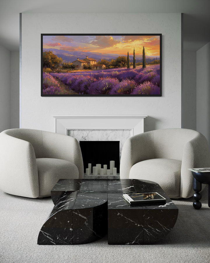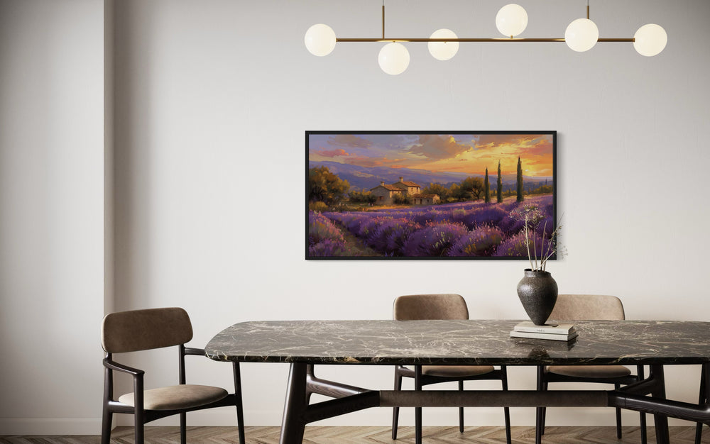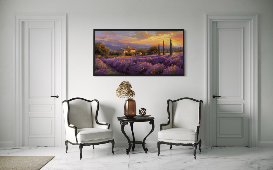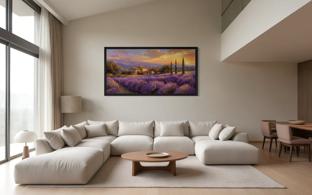 La palette de couleurs de ce paysage provençal est dominée par des violets profonds, des jaunes chauds et des bruns terreux, capturant magnifiquement la magie d'un coucher de soleil sur les champs de lavande. Les riches teintes violettes de la lavande contrastent avec les tons dorés du soleil couchant, créant un mélange harmonieux à la fois apaisant et vibrant. Des oranges douces et des verts subtils en arrière-plan ajoutent de la profondeur à la scène, rehaussant sa beauté naturelle. Cette combinaison réfléchie de couleurs chaudes et froides apporte un sentiment d'équilibre à l'œuvre d'art, la rendant adaptable à divers styles de décoration. Les couleurs reflètent la riche beauté de la campagne française, garantissant que cette pièce complète à la fois les intérieurs traditionnels et modernes.
