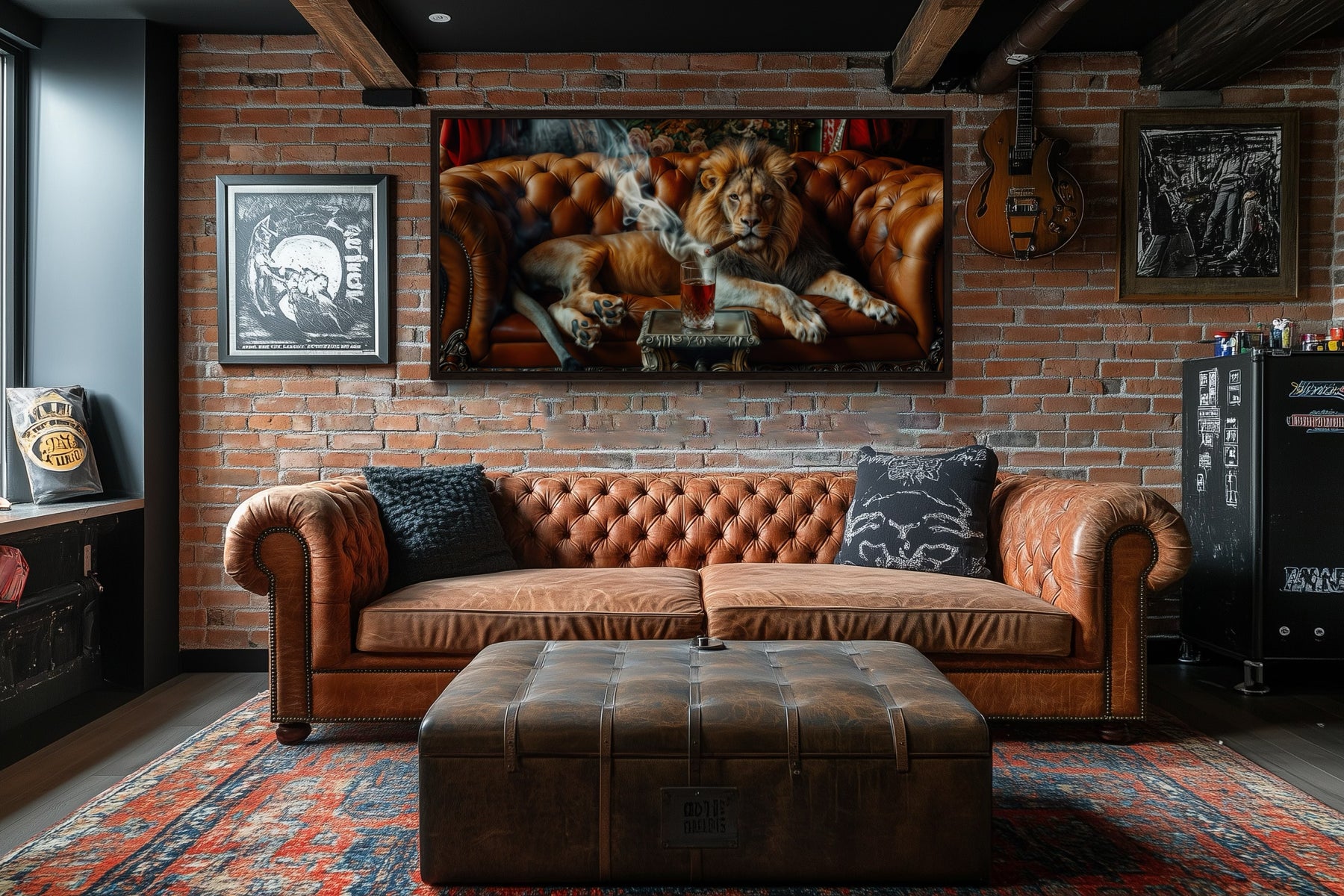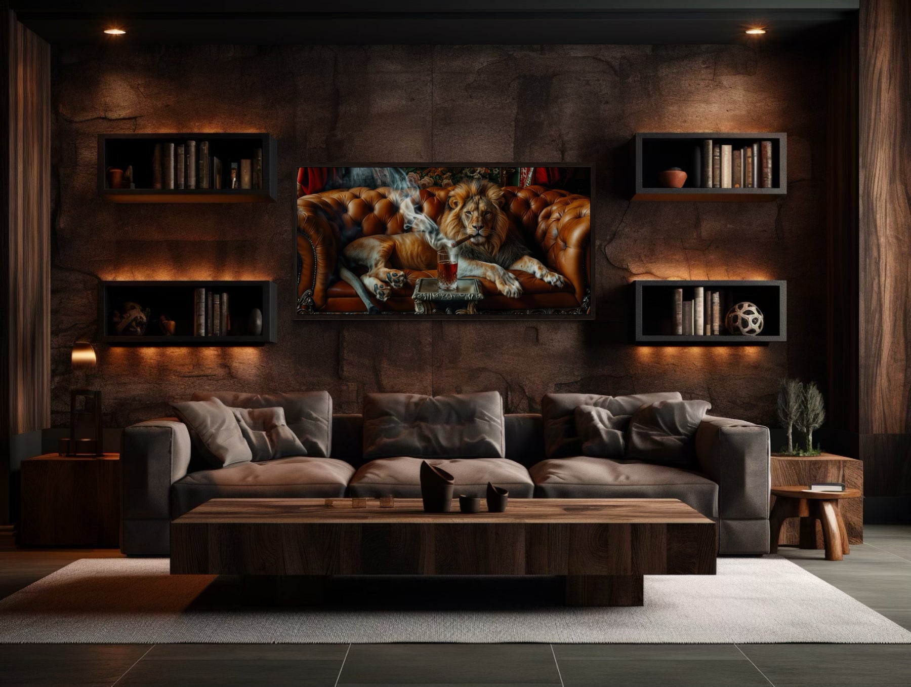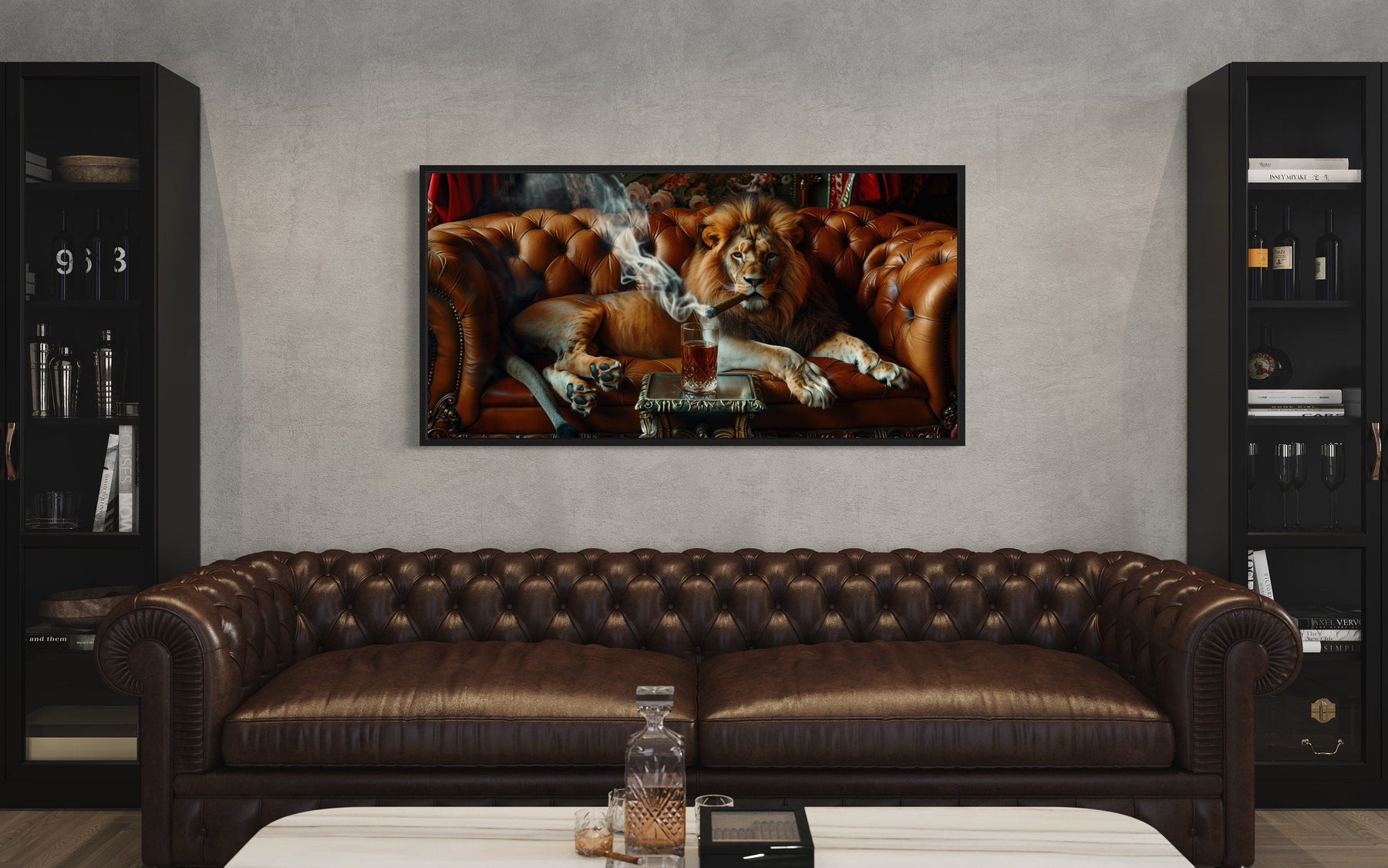 Transformez votre caverne d'homme ou votre salon avec cette œuvre d'art murale unique représentant un lion majestueux allongé sur un canapé, fumant un cigare et sirotant du whisky. Cette impression sur toile encadrée allie luxe et audace, ce qui en fait une pièce de déclaration exceptionnelle pour n'importe quel espace. La représentation détaillée du lion dégage un air de sophistication et de confiance, parfait pour ceux qui apprécient les décors forts et charismatiques. Cette impression sur toile de lion est conçue pour être le point central de votre pièce, ajoutant un élément de puissance et de détente à votre caverne d'homme ou à votre bureau.