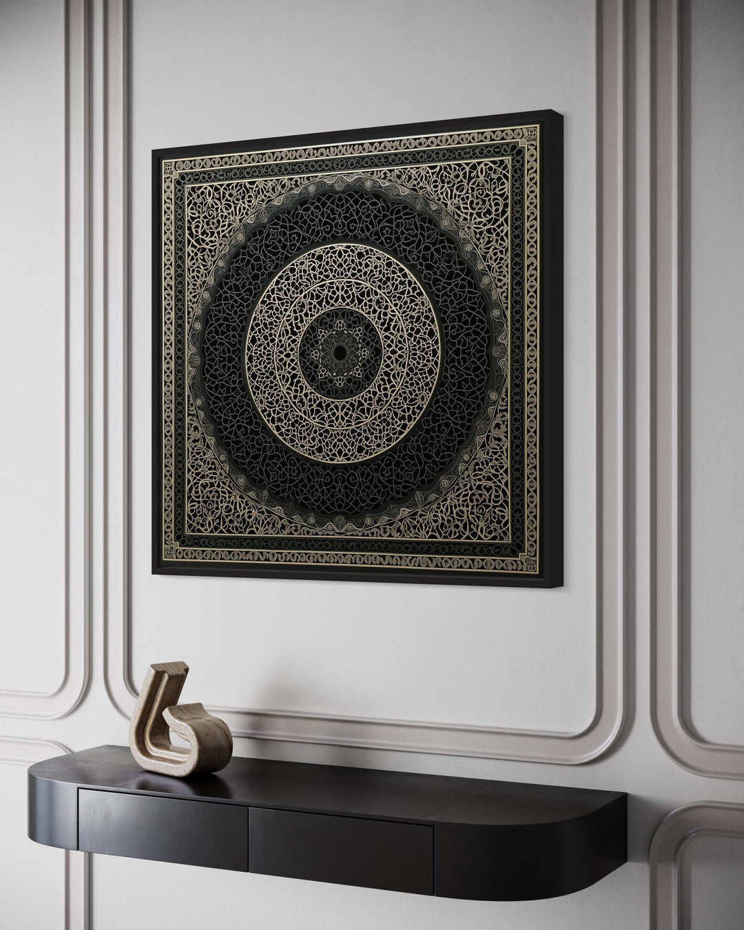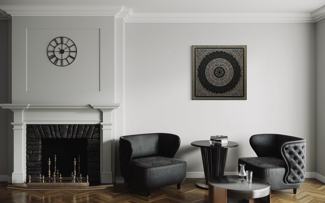 La palette de couleurs de cette toile imprimée mandala indienne est un mélange sophistiqué de noir, de gris et d'or doux, soulignant les détails complexes du design. Le contraste entre les tons sombres et clairs crée de la profondeur, donnant au motif mandala un aspect tridimensionnel. Les nuances atténuées confèrent à la pièce une élégance moderne tout en conservant ses racines traditionnelles. L'interaction des couleurs évoque un sentiment de calme et de concentration, idéal pour les espaces conçus pour la détente ou l'introspection. Ces tons sont polyvalents, permettant à l'œuvre d'art de compléter des intérieurs minimalistes ou de se démarquer dans des environnements plus éclectiques. Les reflets métalliques subtils ajoutent une touche de luxe, améliorant l'impact visuel sans surcharger le design. Cette palette soigneusement sélectionnée garantit que l'art du mandala s'intègre parfaitement dans n'importe quelle pièce tout en attirant l'attention sur son savoir-faire exquis.