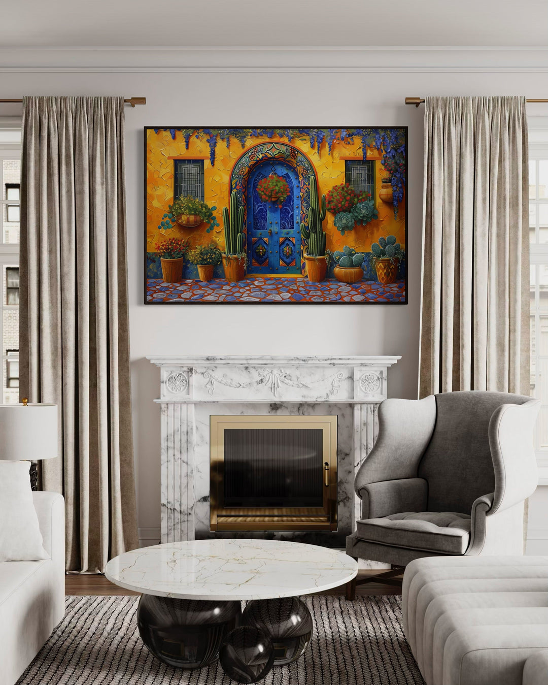 La palette de couleurs de ce tableau est un mélange accrocheur de tons chauds et froids. Les murs jaune vif sont lumineux et pleins d'énergie, contrastant magnifiquement avec la porte bleue froide qui se trouve au centre de la pièce. Les verts profonds des cactus ajoutent un élément terreux et naturel, tandis que de petits accents de pots en terre cuite et des détails décoratifs apportent de la chaleur et un sens de l'artisanat à la composition. Ensemble, ces couleurs créent une scène dynamique mais harmonieuse, reflétant la beauté naturelle et l'architecture vibrante des maisons mexicaines traditionnelles. Cette œuvre d'art est idéale pour les espaces qui adoptent des couleurs vives et gaies.
