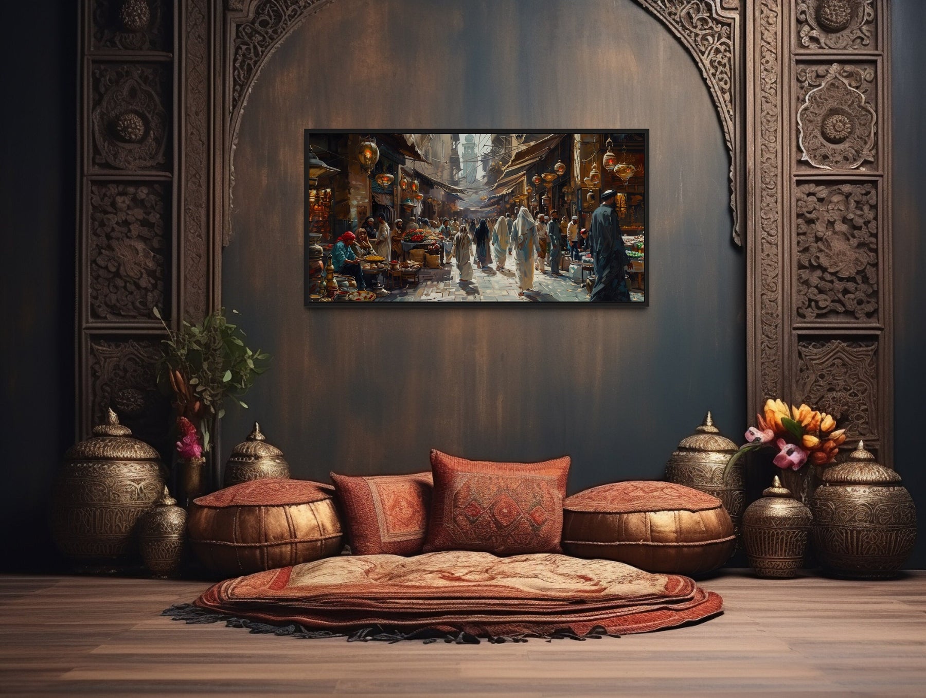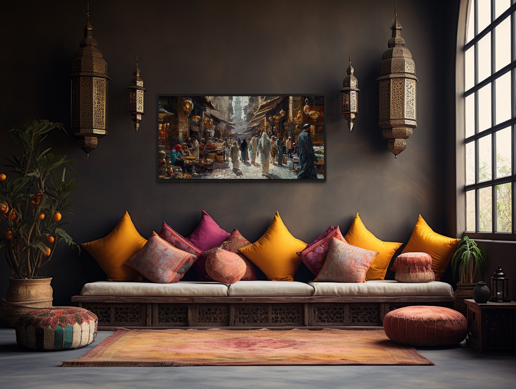 Cette toile murale représentant un bazar de fruits du Moyen-Orient est parfaite pour les maisons qui adoptent des styles de décoration culturels, éclectiques ou rustiques. Elle s'intègre parfaitement dans les salles à manger, où sa représentation vibrante de fruits renforce le lien avec la nourriture et les rassemblements. Dans les cuisines, elle ajoute de la chaleur et du caractère, créant une atmosphère accueillante et animée. Les salons bénéficient de son énergie dynamique et de son attrait culturel, ce qui en fait un point focal pour les conversations et l'admiration. La pièce se marie bien avec les meubles traditionnels du Moyen-Orient ou se marie parfaitement avec des décors modernes et minimalistes pour un contraste saisissant. Sa disposition horizontale est particulièrement adaptée aux espaces au-dessus des tables à manger, des comptoirs de cuisine ou des coins salon. Qu'elle soit exposée dans une maison ou un restaurant à thème moyen-oriental, cette œuvre d'art apporte authenticité et charme. Transformez votre espace avec la beauté intemporelle de cette toile murale représentant un bazar de fruits, témoignage de tradition et de maîtrise artistique.
