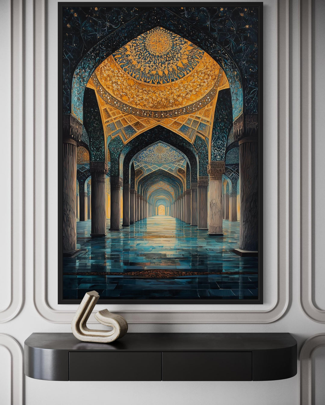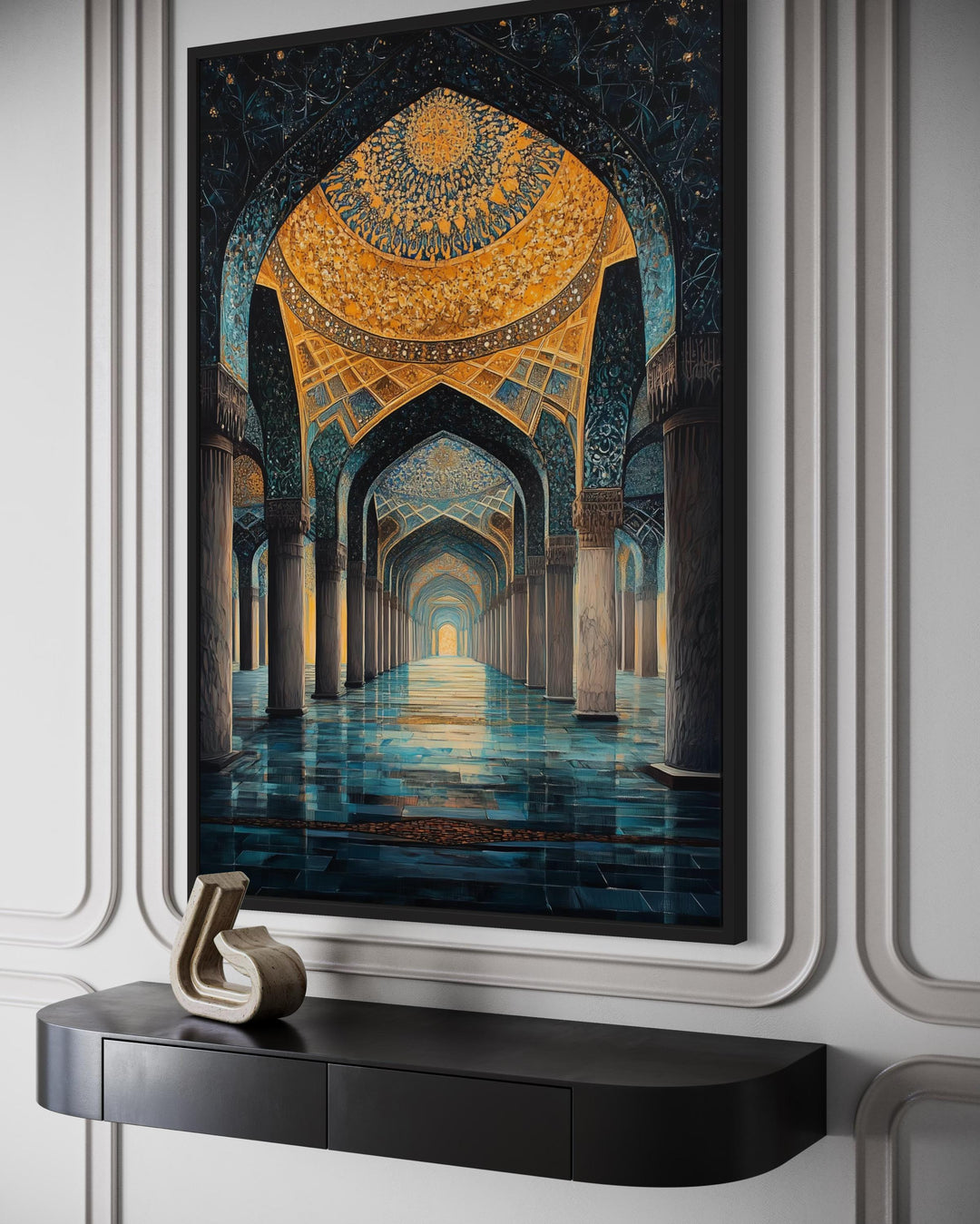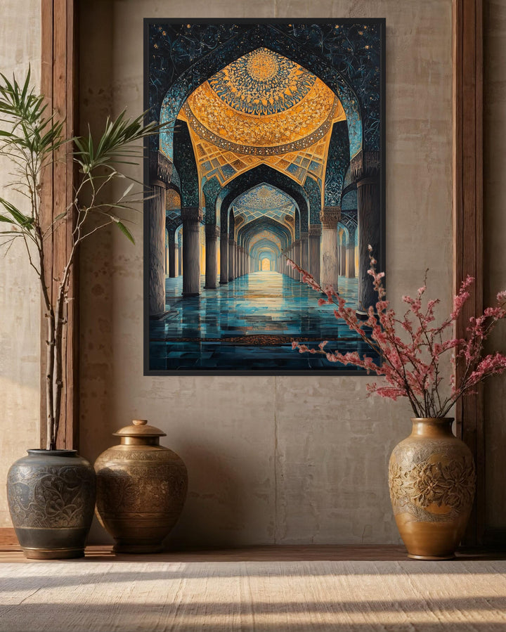 Notre tableau de mosquée est une pièce maîtresse naturelle pour les espaces sereins, empreints d'élégance spirituelle ou d'une décoration éclectique et internationale. Idéale pour les salles de prière, les coins méditation ou les entrées où révérence et beauté se rencontrent, cette toile insuffle une sensation de paix dès l'entrée. Son format vertical s'intègre parfaitement au-dessus d'une console, d'une niche décorative ou d'un canapé, dans les pièces ornées de riches textiles, de tapis tissés ou d'éléments en bois sculpté. Dans les intérieurs d'inspiration marocaine, bohème ou moyen-orientale, cette œuvre marie luminaires ornementaux, miroirs en arc et coussins aux tons naturels pour créer une harmonie. Elle est particulièrement adaptée aux espaces aux tons précieux, comme le vert émeraude, l'indigo ou la cannelle, où elle apporte un intérêt visuel subtil et une résonance symbolique. Les touches d'or et de turquoise s'harmonisent également avec les luminaires en laiton, les tissus ivoire et les meubles en bois teinté foncé, souvent présents dans les maisons d'inspiration islamique. Qu'elle soit accrochée dans un coin lecture tranquille, un bureau rempli de livres et de bougies, ou un couloir où les invités s'arrêtent avant d'entrer, cette œuvre transforme les murs ordinaires en portails sacrés. Sa finition encadrée la rend idéale pour une galerie d'art, idéale pour les intérieurs soignés ou les maisons culturelles qui valorisent l'art avec une âme. Chaque espace sacré est sublimé par nos œuvres murales encadrées de mosquée.
