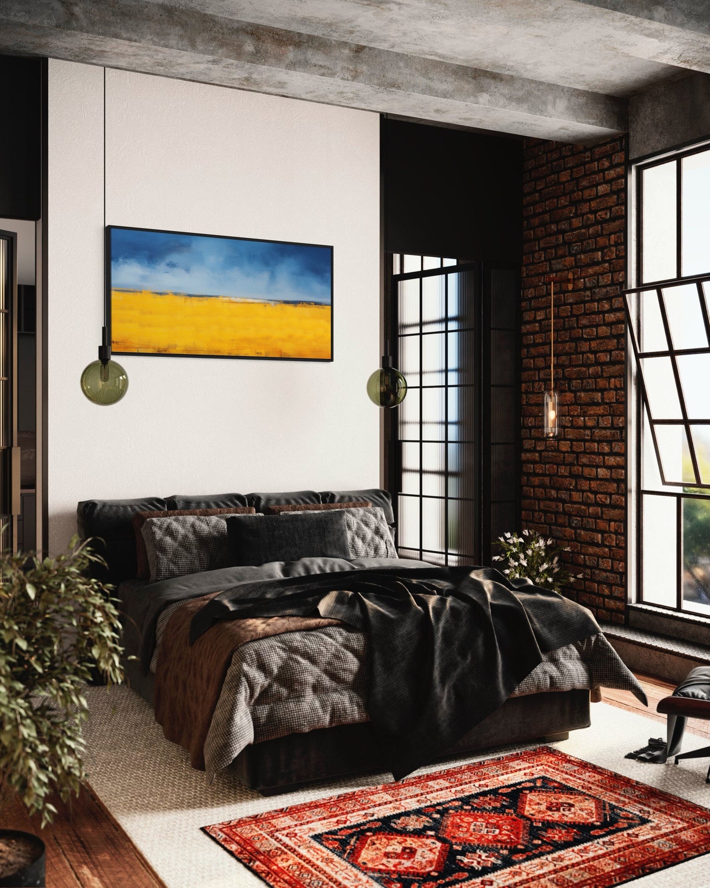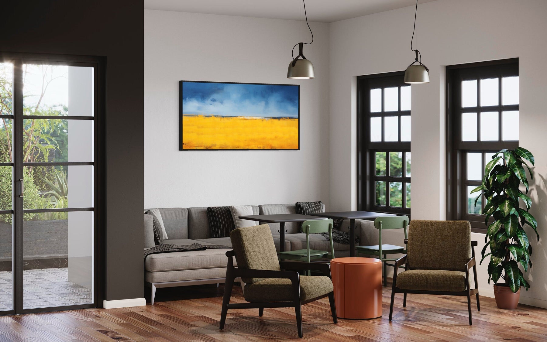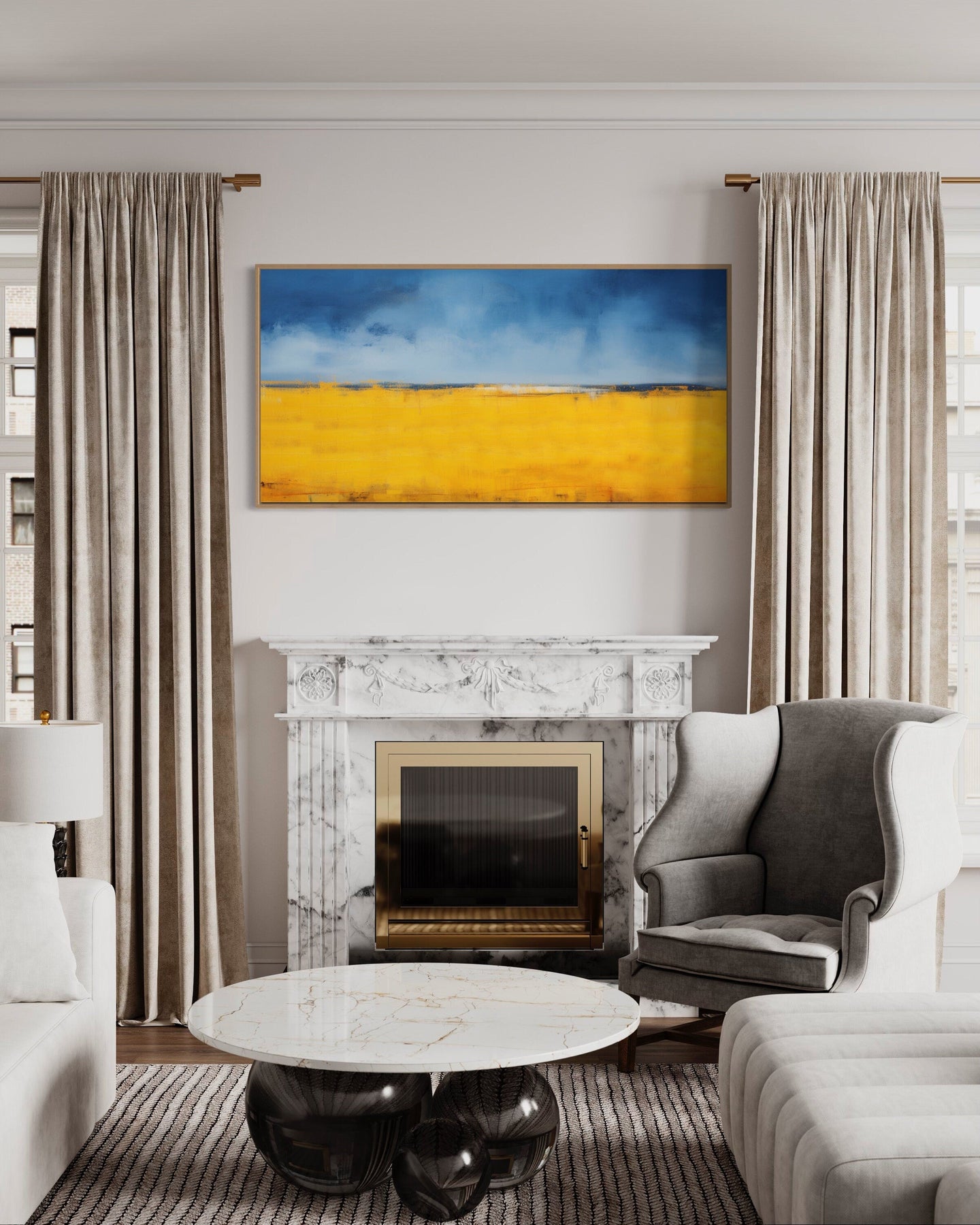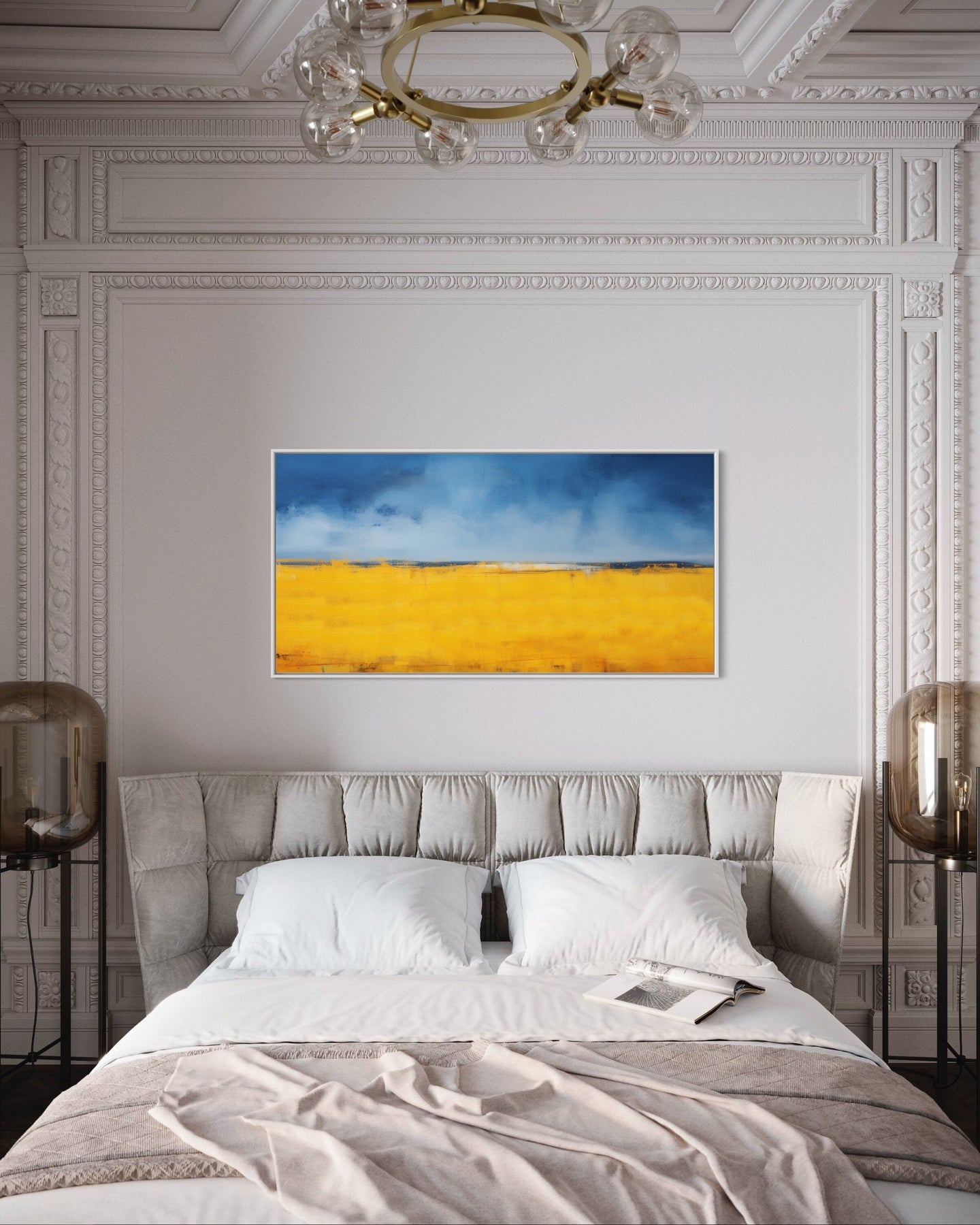 L'œuvre d'art présente une interaction harmonieuse de deux couleurs emblématiques : le bleu et le jaune. Le bleu profond du ciel respire le calme et la stabilité, tandis que le jaune radieux du champ de tournesols symbolise l'énergie et la chaleur. Ensemble, ces tons créent une composition vibrante mais équilibrée qui anime votre espace sans le dominer. Les dégradés subtils dans le bleu et les teintes dorées ajoutent de la profondeur et de la dimension, rendant la pièce visuellement captivante. Sa simplicité met en valeur la beauté du contraste, garantissant qu'elle complète à la fois les intérieurs neutres et colorés. La combinaison de couleurs frappante porte également une signification symbolique puissante, représentant l'unité et l'espoir. Qu'elles soient associées à des meubles modernes ou à des pièces en bois classiques, les couleurs s'adaptent sans effort à votre décor. Cette décoration murale minimaliste de paysage ukrainien bleu et jaune est un mélange parfait de beauté et de signification, ce qui en fait un élément remarquable dans n'importe quelle pièce.