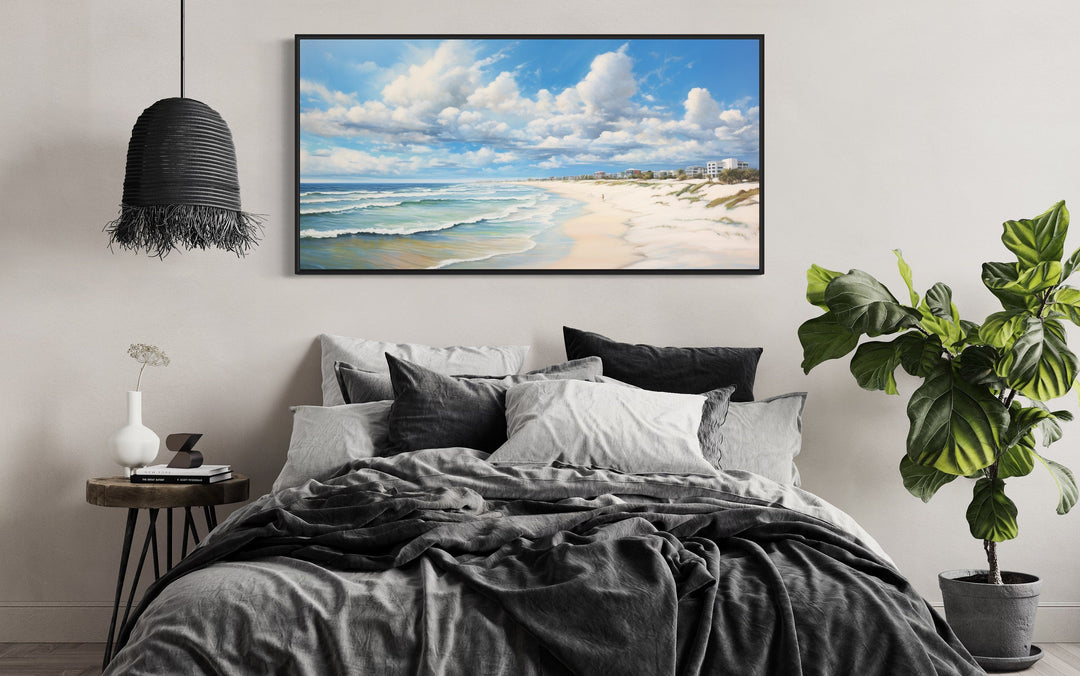 Cette toile encadrée est suffisamment polyvalente pour convenir aux maisons de plage, aux espaces urbains et aux maisons modernes. Son thème côtier en fait un ajout parfait aux salons, chambres ou salles à manger à la recherche d'une ambiance sereine et balnéaire. Les lignes épurées et le design contemporain s'intègrent parfaitement dans les intérieurs minimalistes ou modernes, ajoutant une touche de sophistication. Pour les maisons côtières, il sert de complément naturel à un décor inspiré de la mer ou de la plage. Dans les environnements urbains, il apporte un contraste rafraîchissant, offrant une évasion sereine de la vie urbaine. Le format panoramique est idéal pour les murs larges ou les espaces au-dessus des meubles comme les canapés ou les lits, où il peut servir de point focal. Associez-le à des accents comme des paniers tressés, du linge de maison léger ou des pièces en bois flotté pour rehausser son charme côtier. Où qu'il soit exposé, cet art mural de paysage de plage moderne apporte une ambiance côtière relaxante et sophistiquée à votre espace.