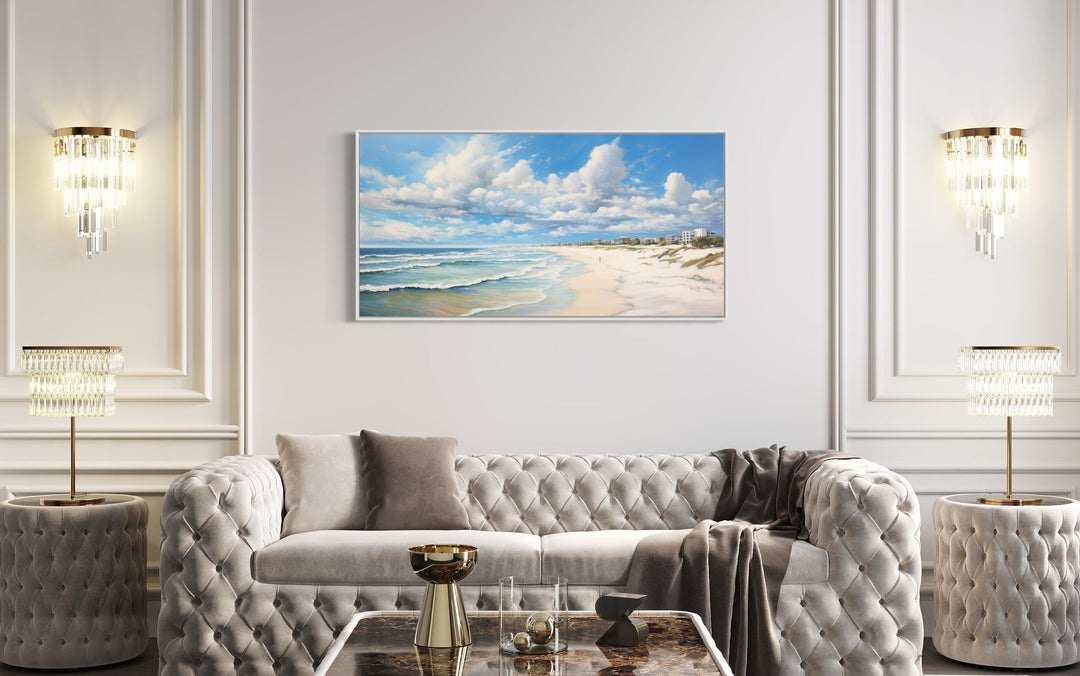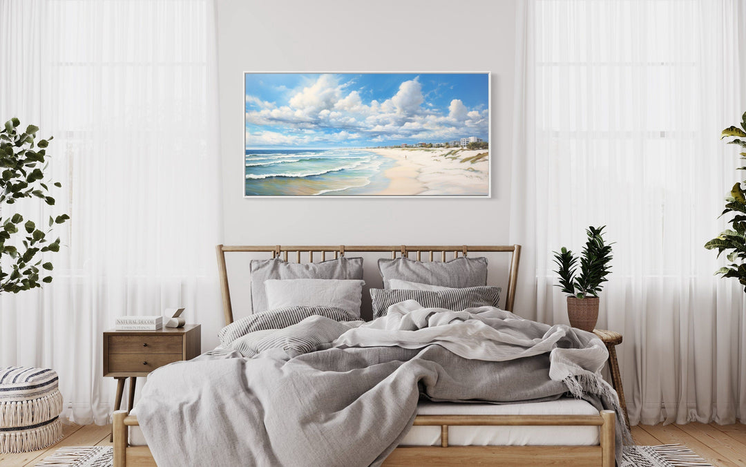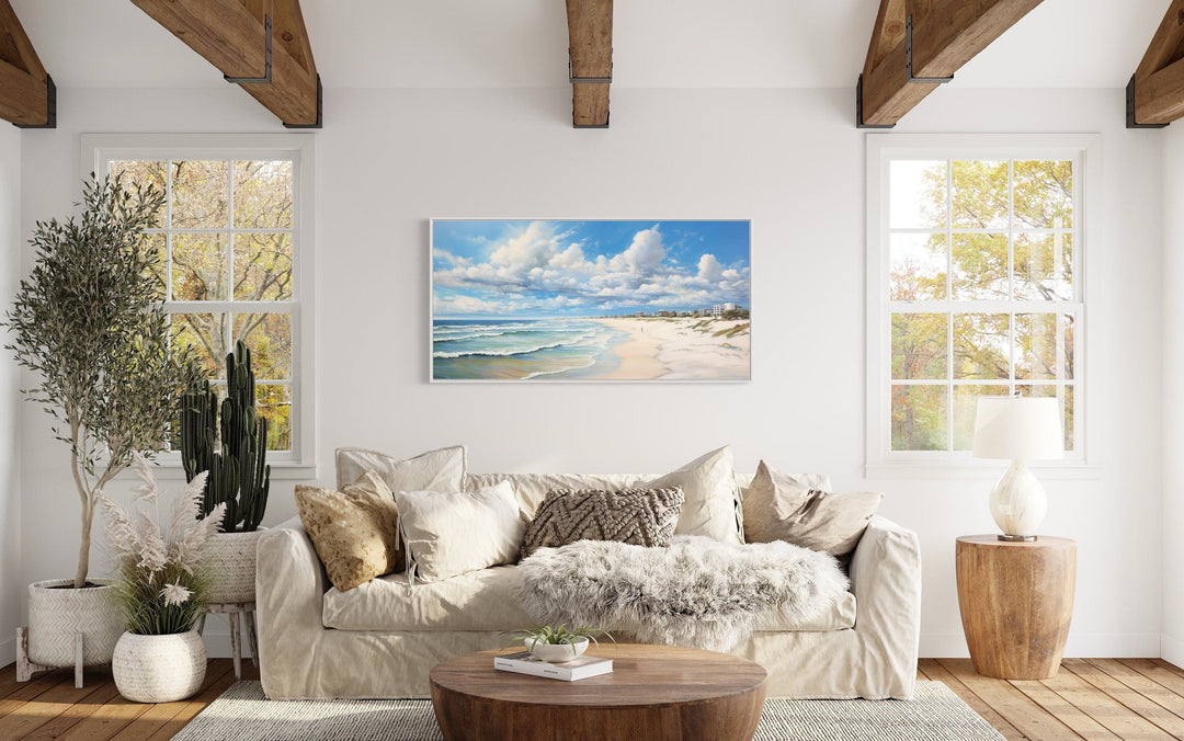 La palette de couleurs de cette œuvre d'art murale côtière est un mélange apaisant de bleus doux, de blancs éclatants et de tons beiges sableux. Les bleus profonds de l'océan transmettent profondeur et sérénité, tandis que les bleus clairs du ciel créent une sensation d'espace et d'ouverture. Les teintes chaudes et sablonneuses du rivage ajoutent de l'équilibre, apportant une touche de chaleur terreuse à la composition. Les accents blancs dans les nuages et la mousse renforcent la luminosité générale, ajoutant un mouvement dynamique à la scène. Ces couleurs sont soigneusement choisies pour compléter une variété de styles de décoration, du minimaliste au chic côtier. Le mélange harmonieux de tons crée une atmosphère paisible, faisant de l'œuvre d'art un ajout parfait aux espaces de détente. Qu'elles soient associées à des textures naturelles comme le bois ou des meubles neutres, les couleurs ressortent magnifiquement. Cette palette vibrante mais apaisante garantit que le tableau restera une pièce intemporelle dans votre maison.