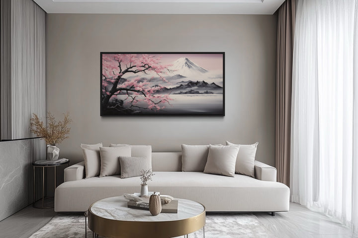 Toile encadrée représentant un paysage de Mont Fuji et de cerisiers roses