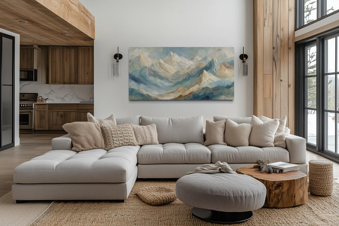 La palette de ce paysage est composée de pastels doux et de neutres subtils, choisis pour évoquer une sensation d'ouverture, de douceur et de paix naturelle. Des bleus ciel poussiéreux s'étendent sur les hauteurs, se fondant dans des turquoises pâles et des gris acier qui forment la base fraîche des sommets lointains. Des tons chauds d'ivoire, de grès clair et de beige apparaissent dans les parties basses et les crêtes du premier plan, apportant chaleur et ancrent l'horizon dans un confort paisible. La lumière est représentée par des blancs crémeux et des argents brumeux, délicatement brossés sur les crêtes les plus élevées, telle la lumière matinale baignant la neige. Chaque couleur est subtile et superposée, jamais dure ni plate ; les tons évoluent au gré des coups de pinceau, imitant la complexité de la nature sans submerger le regard. Un soupçon de gris lavande flotte sur les pentes ombragées, ajoutant de la profondeur visuelle et une touche d'air frais de montagne. Ces teintes se fondent de manière plus ressentie que définie : pas de couleur focale audacieuse, seulement un équilibre continu. Le fond se fond dans des tons crème et parchemin doux, évoquant le toucher du papier vieilli ou la brume matinale diffuse. Ces tons harmonieux définissent l'ambiance de cette toile murale représentant un paysage de montagne aux tons pastel neutres.