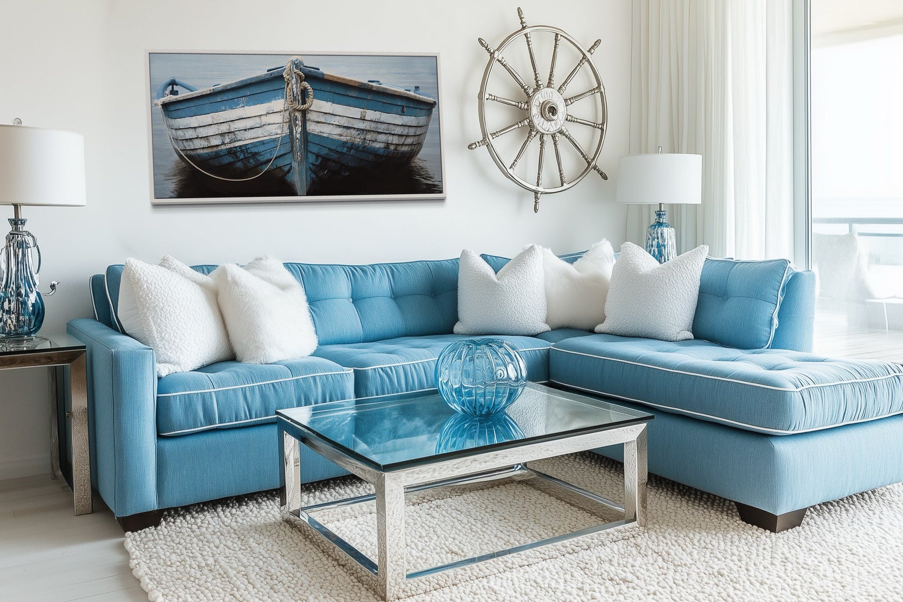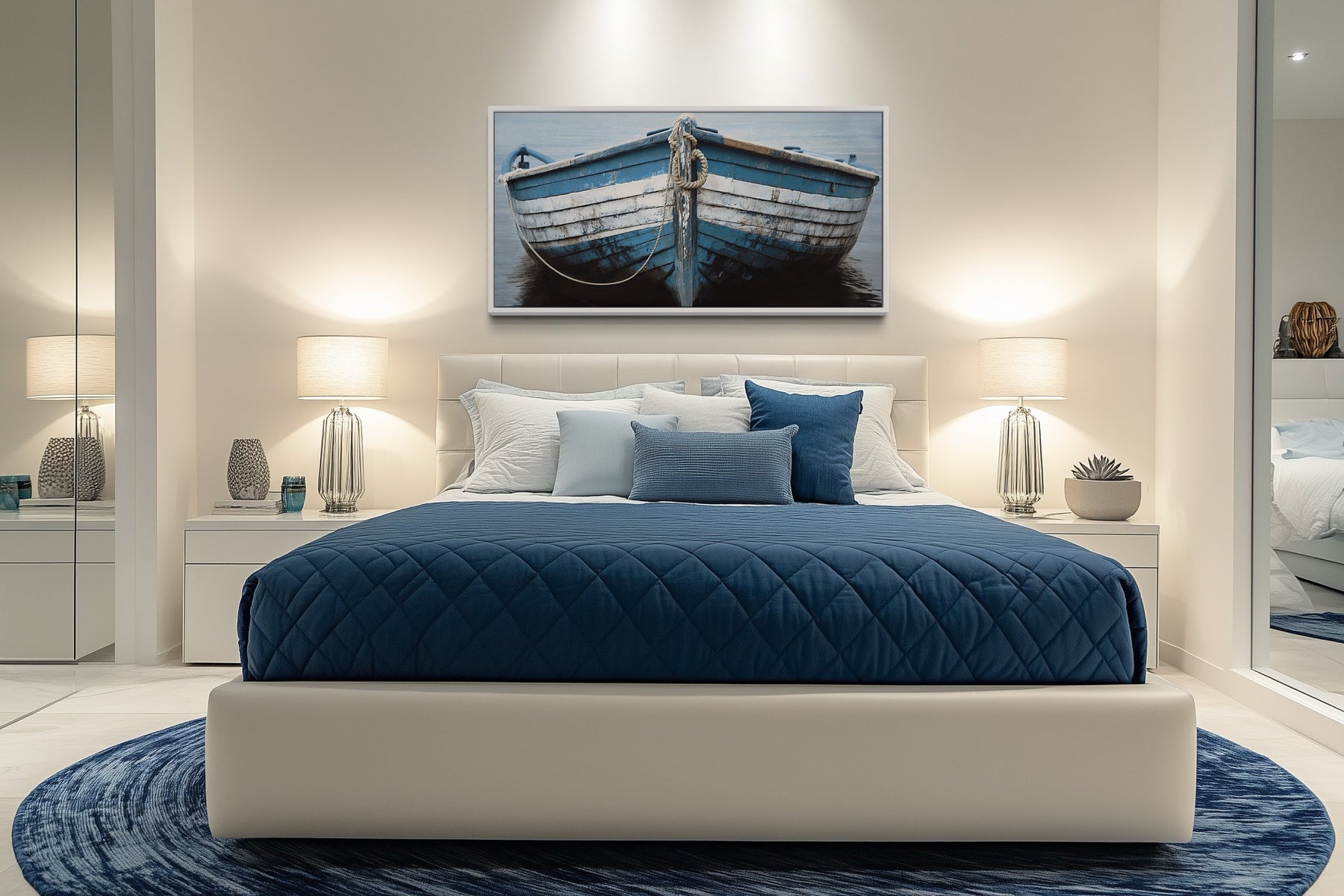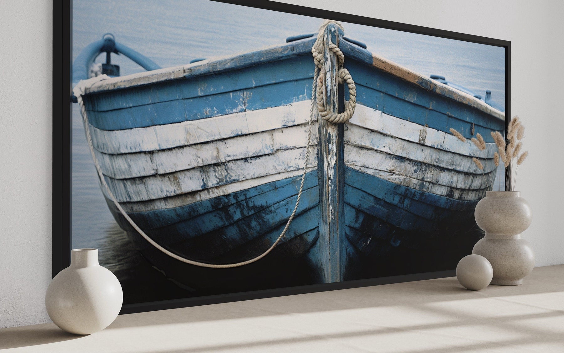 Décoration murale rustique sur toile représentant un bateau – Impression sur toile bleue et blanche à motif nautique pour une ambiance bord de mer