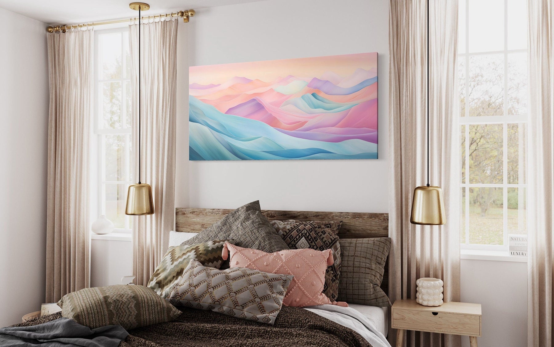 Transformez votre espace de vie avec les teintes apaisantes de notre art mural pastel rose bleu. Cette peinture abstraite de paysage de montagne en marbre présente un mélange étonnant de roses et de bleus pastel, créant une atmosphère sereine et rêveuse. Le long design horizontal le rend parfait pour être placé au-dessus du lit ou du canapé, ajoutant une touche d'élégance à votre pièce. Cette œuvre d'art est méticuleusement imprimée sur une toile de haute qualité, garantissant que les couleurs restent vives et fidèles à la réalité. Idéale pour les intérieurs modernes, cette impression sur toile apporte une sensation de calme et de sophistication à n'importe quel espace. Découvrez la beauté de l'art abstrait avec cette pièce unique.