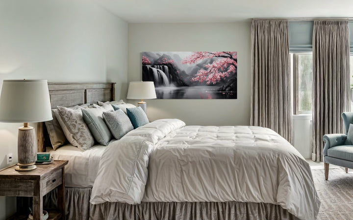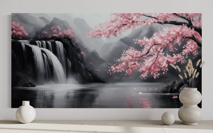 Toile encadrée représentant des fleurs de cerisier roses et une cascade grise