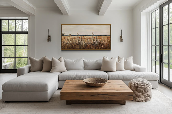 La palette de couleurs de ce tableau de fleurs sauvages est un mélange harmonieux de tons terreux et neutres, parfait pour créer une atmosphère chaleureuse et accueillante. De riches teintes d'ambre, de beige et de brun doux forment la toile de fond, tandis que les fleurs sauvages elles-mêmes ajoutent des touches de vert et des touches subtiles d'orange et de jaune. Ces couleurs douces sont conçues pour évoquer l'essence apaisante de la nature, rendant l'œuvre d'art à la fois vibrante et apaisante. Les tons discrets du champ contrastent magnifiquement avec les reflets délicats des fleurs, attirant l'attention sur leurs détails complexes. La palette naturelle met en valeur le thème rustique, s'associant parfaitement aux accents de bois et aux meubles neutres. Une touche de blanc doux dans les fleurs et le ciel ajoute de la luminosité et de l'équilibre, garantissant que l'œuvre d'art est fraîche et intemporelle. Cette palette de couleurs est idéale pour compléter la décoration de la ferme ou ajouter une touche de charme rustique aux intérieurs modernes. Laissez les tons chauds de cette décoration murale de champ de fleurs sauvages apporter vie et caractère à votre espace.