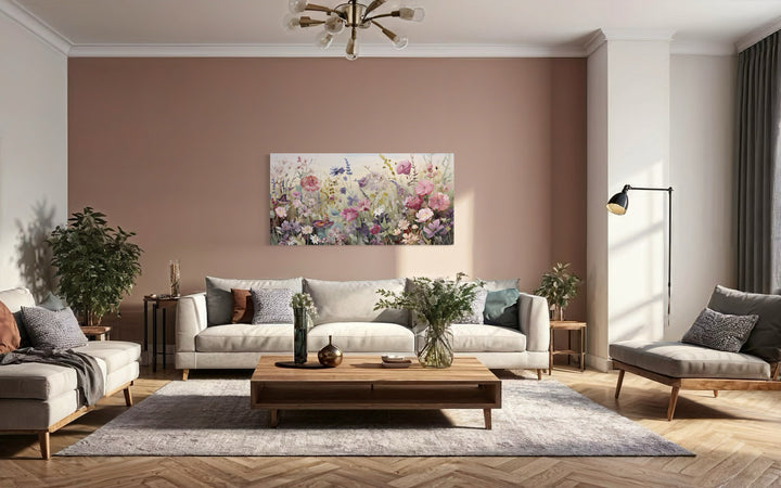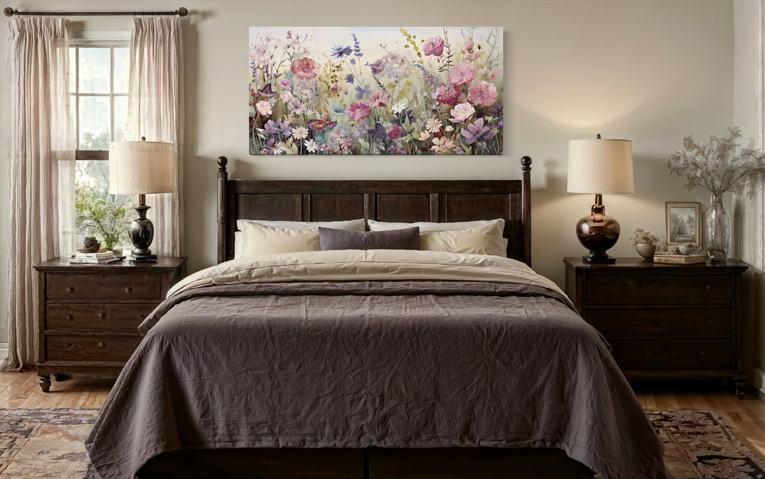 Toile encadrée rustique représentant une prairie de fleurs sauvages violettes