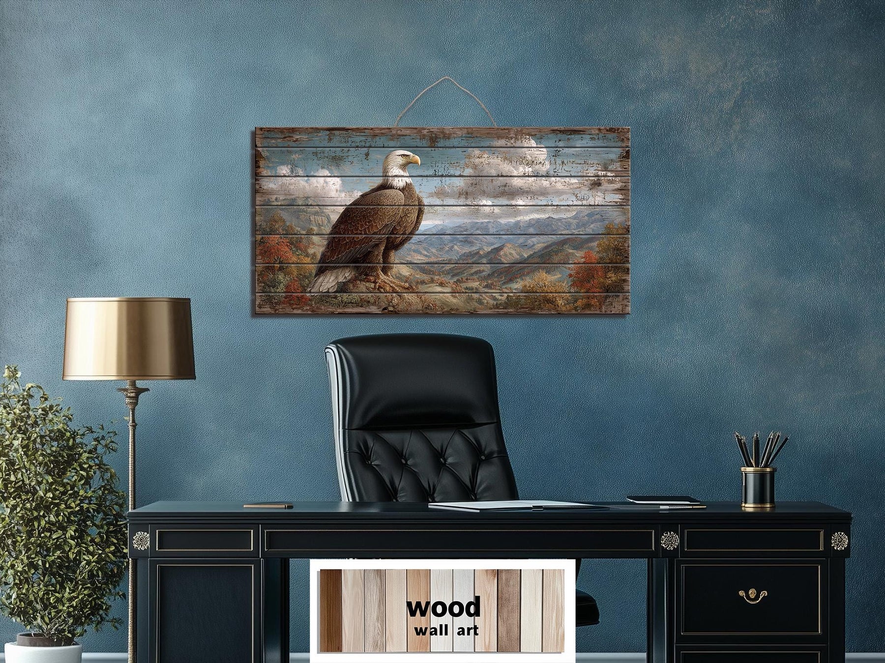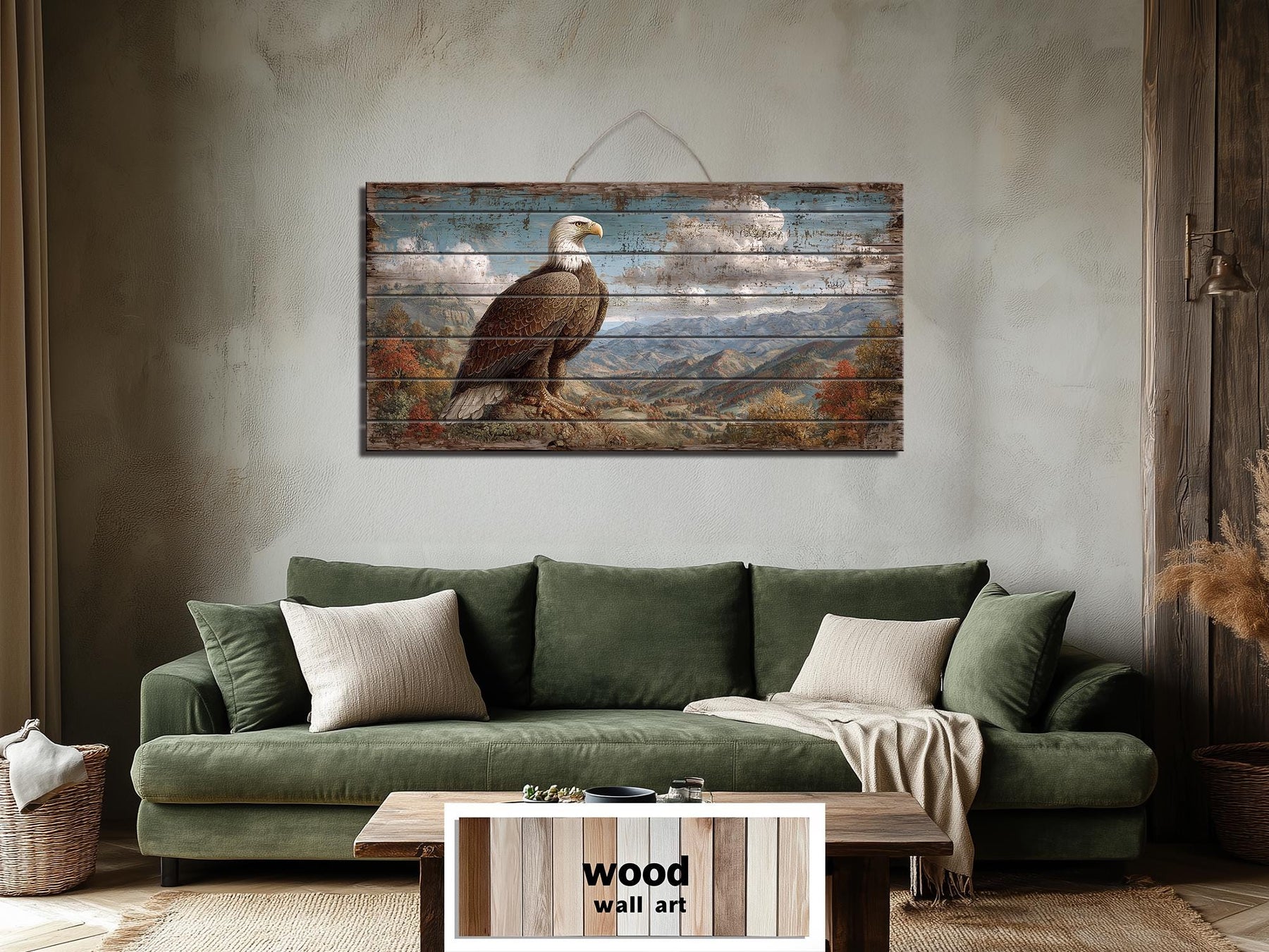 Décoration murale rustique représentant un aigle à tête blanche – Paysage de montagne en bois vieilli | Décoration pour hommes