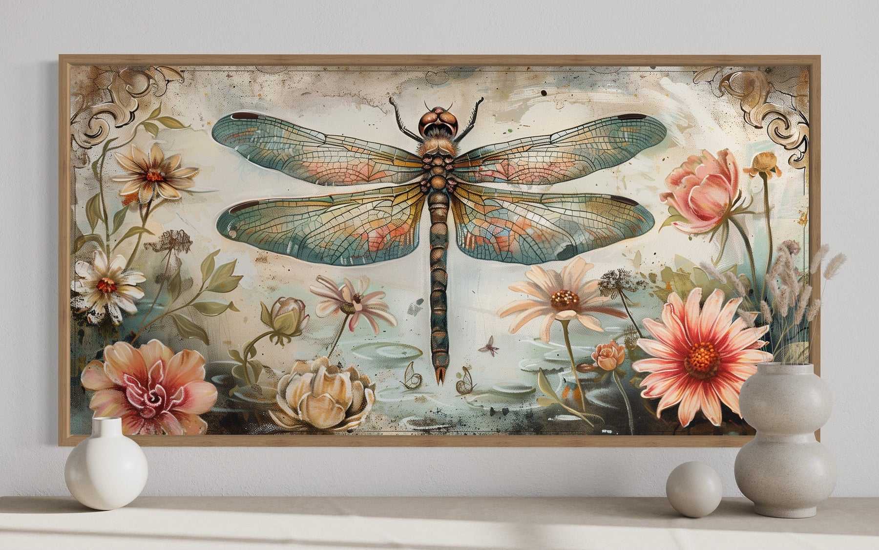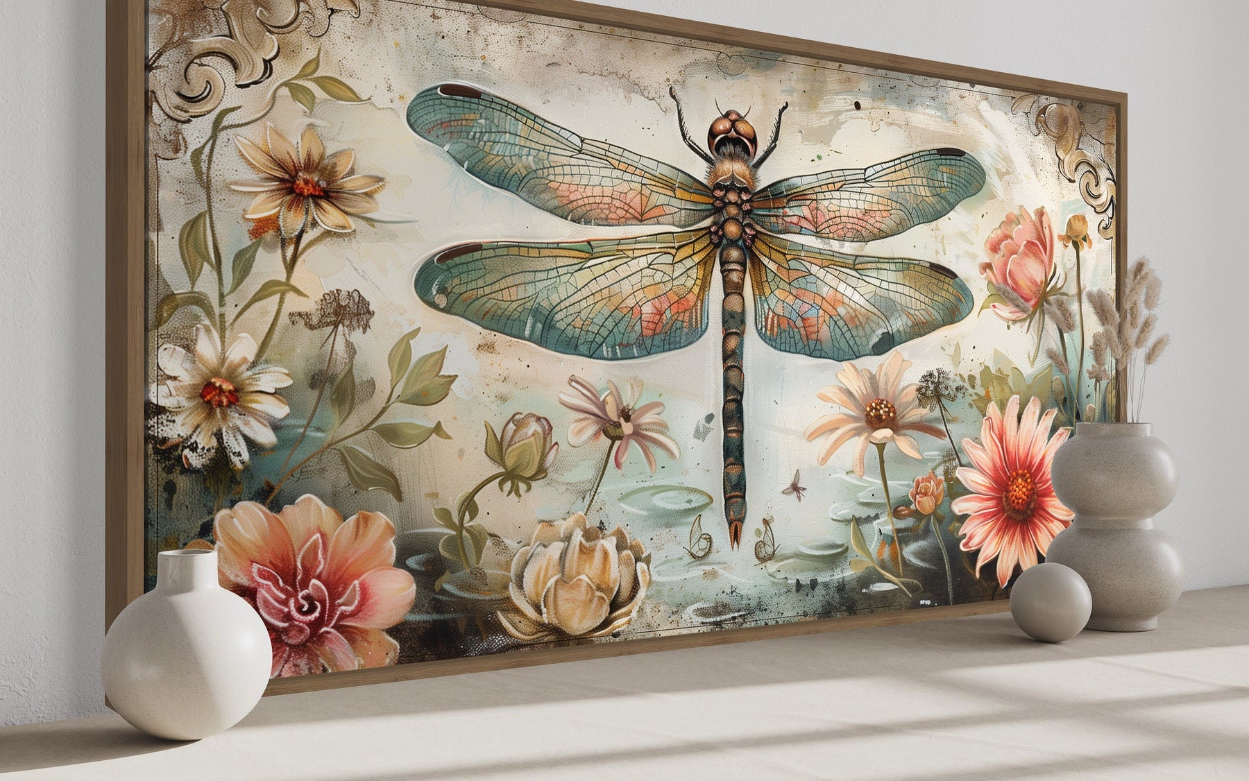 Rustic Dragonfly Wall Art – Framed Canvas Floral Illustration for Farmhouse Decor