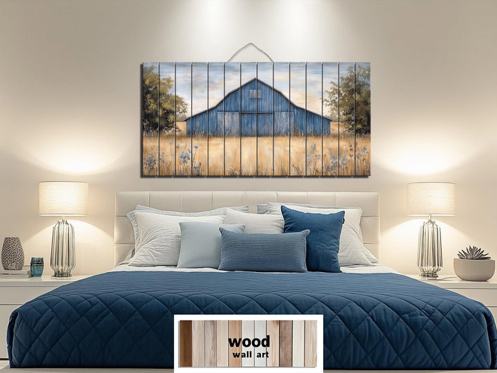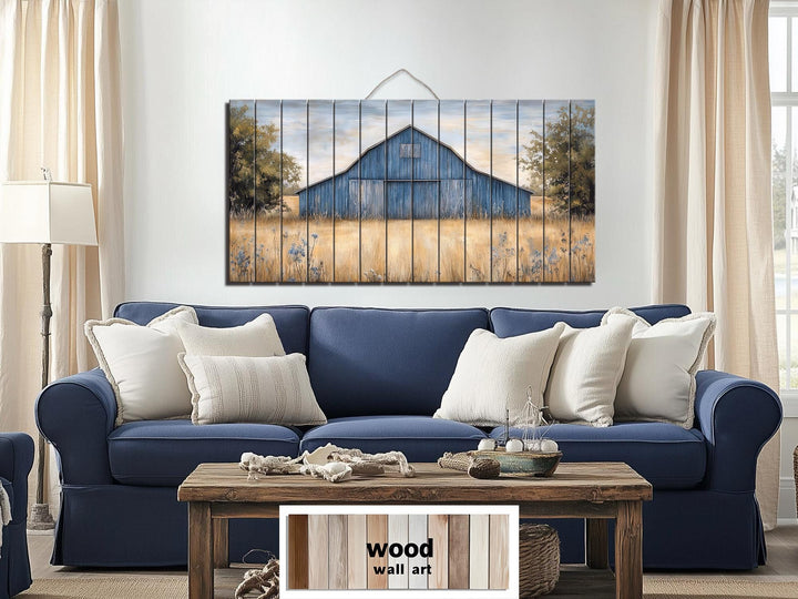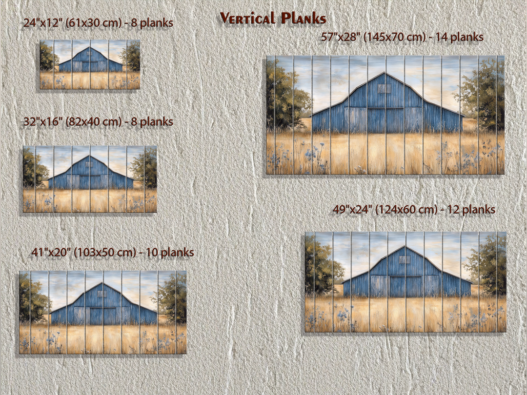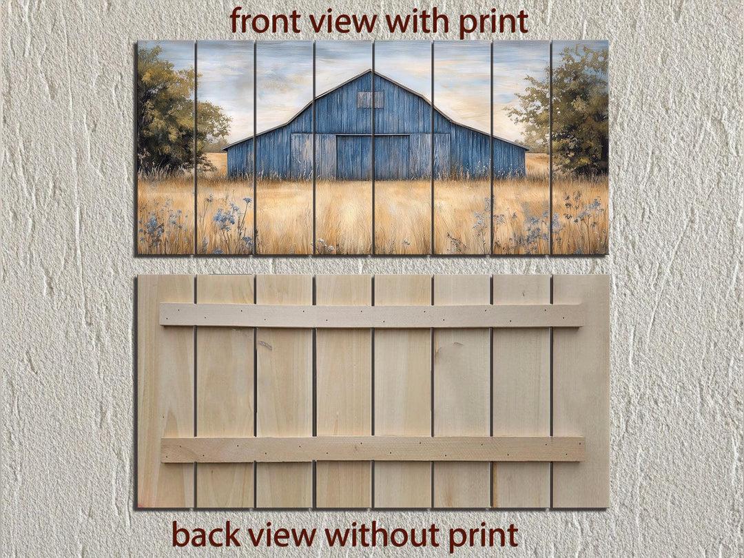 Notre décoration murale rustique en bois de grange bleu ancien présente une scène champêtre saisissante, imprimée directement sur de véritables planches de bois, apportant une texture rustique authentique à votre mur. Au cœur de cette composition horizontale se trouve une grange magnifiquement illustrée, patinée par le temps dans des tons bleus doux, nichée dans un paysage paisible. Ses lignes épurées et son toit usé offrent un équilibre parfait entre structure et charme du temps, lui conférant une touche nostalgique et visuellement apaisante. Derrière la grange, vous découvrirez des touches de champs dorés, de douces lignes d'horizon et des tons doux du ciel qui contribuent à une atmosphère champêtre apaisante. Les planches de bois naturel sous l'impression laissent transparaître le grain du bois, les nœuds subtils et les marques du temps, conférant à l'œuvre un aspect artisanal et récupéré. La grange est centrée, légèrement surélevée, et encadrée de teintes naturelles chaudes qui mettent en valeur les tons bleus sans surcharger le décor. Cette disposition rend cette œuvre particulièrement adaptée pour être placée au-dessus de lits, de canapés ou de buffets dans les maisons de style campagnard. Qu'elle soit accrochée dans une chambre d'amis ou dans un salon, cette œuvre d'art dégage une impression d'authenticité, de chaleur et de composition soignée. Cette décoration murale rustique en bois véritable, inspirée d'une vieille grange bleue, crée un point focal paisible et campagnard, empreint d'héritage et de simplicité.