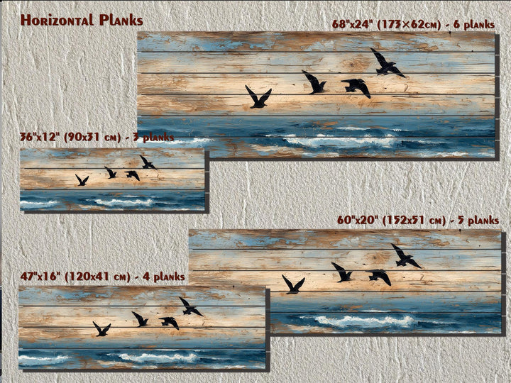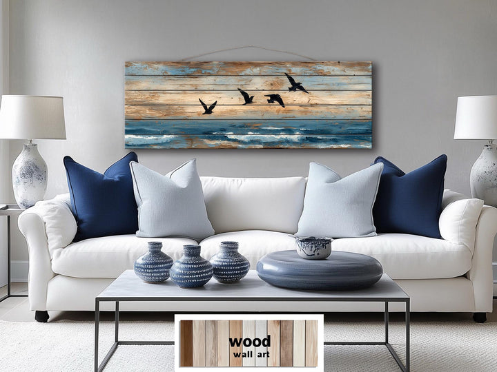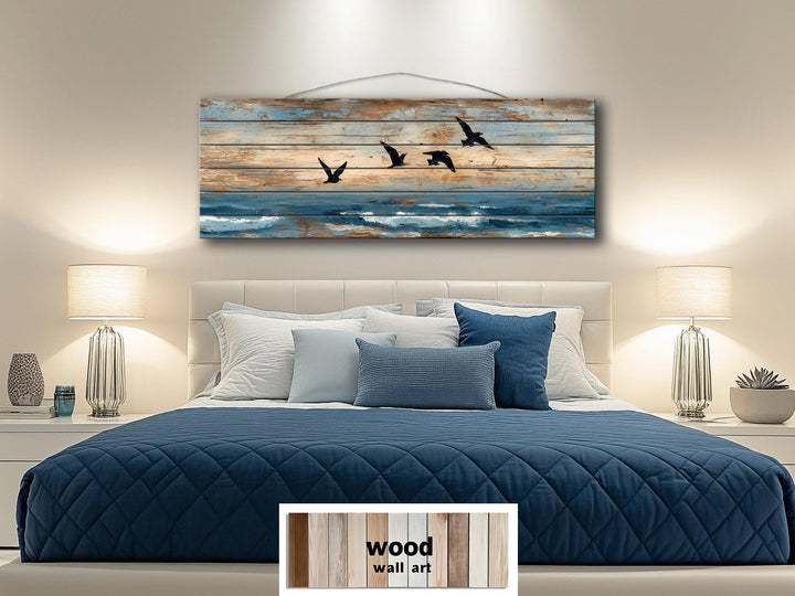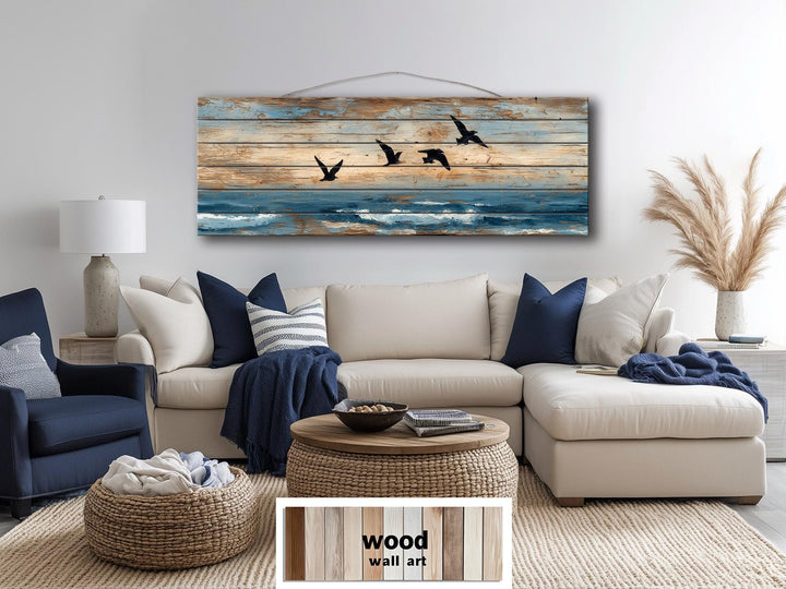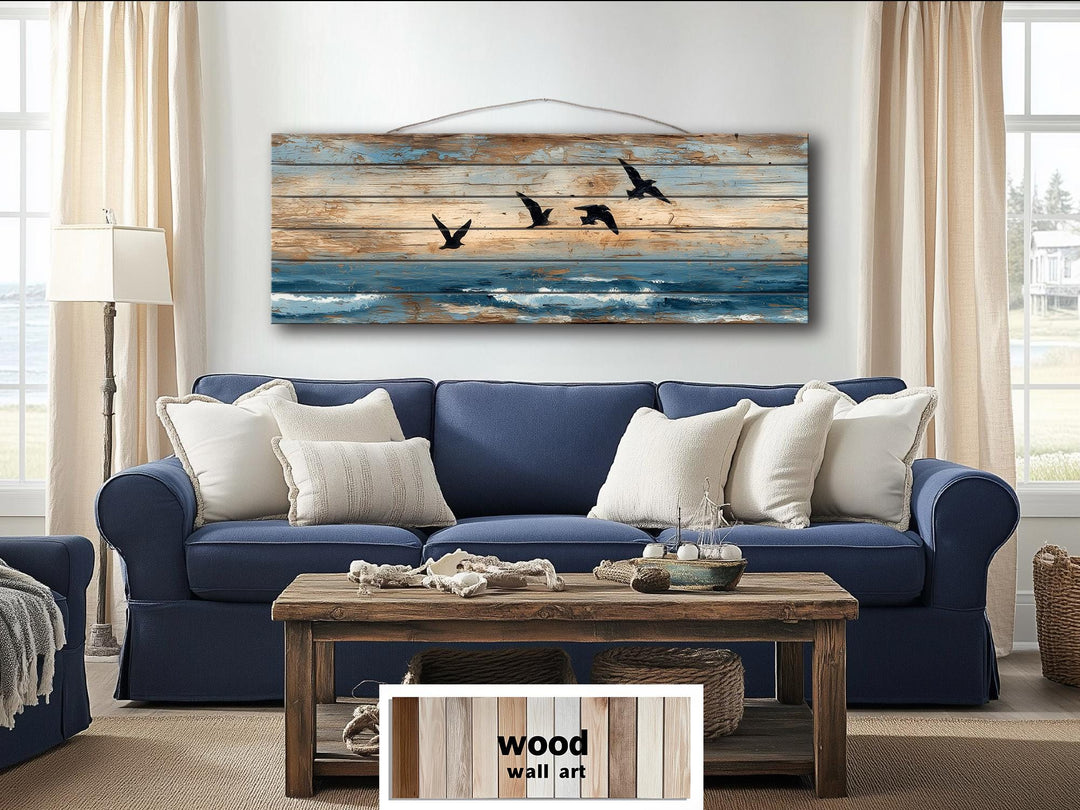 Décoration murale horizontale en bois vieilli représentant des oiseaux de mer au-dessus de l'océan