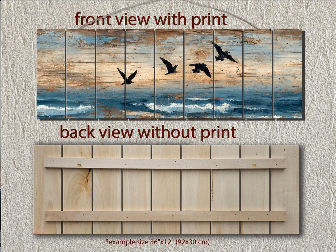 Ce panneau mural horizontal côtier est parfait pour les maisons au charme d'une maison de plage, au minimalisme inspiré de l'océan ou à la décoration rustique et décontractée qui célèbre le calme et la clarté. Sa forme allongée le rend idéal au-dessus d'un canapé, dans une véranda ou le long d'un mur de couloir, où le mouvement linéaire apporte une continuité à l'espace. Il est particulièrement adapté aux chambres, salles de bains ou salons aérés de style côtier, où la lumière naturelle et les tons océaniques sont déjà présents. Les tons neutres et doux s'associent parfaitement aux bois blanchis à la chaux, aux plaids bleu clair, aux tapis en fibres naturelles et aux textiles en lin. Que votre espace soit un véritable refuge côtier ou qu'il évoque simplement la mer par de subtiles touches, ce tableau s'intègre parfaitement. Il s'intègre aussi bien aux cottages à thème nautique qu'aux intérieurs modernes et sereins grâce à sa composition épurée et à sa palette douce. Pour ceux qui trouvent la paix dans les rivages, les mouettes ou le souvenir de la brise marine, cette œuvre d'art représentant des oiseaux en vol au-dessus de la mer est un rappel quotidien de ce rythme. Son design peut servir de point focal ou s'intégrer à une galerie murale apaisante composée d'éléments de plage. Laissez votre maison respirer avec le mouvement et l'immobilité de cette décoration murale rustique en bois océanique.