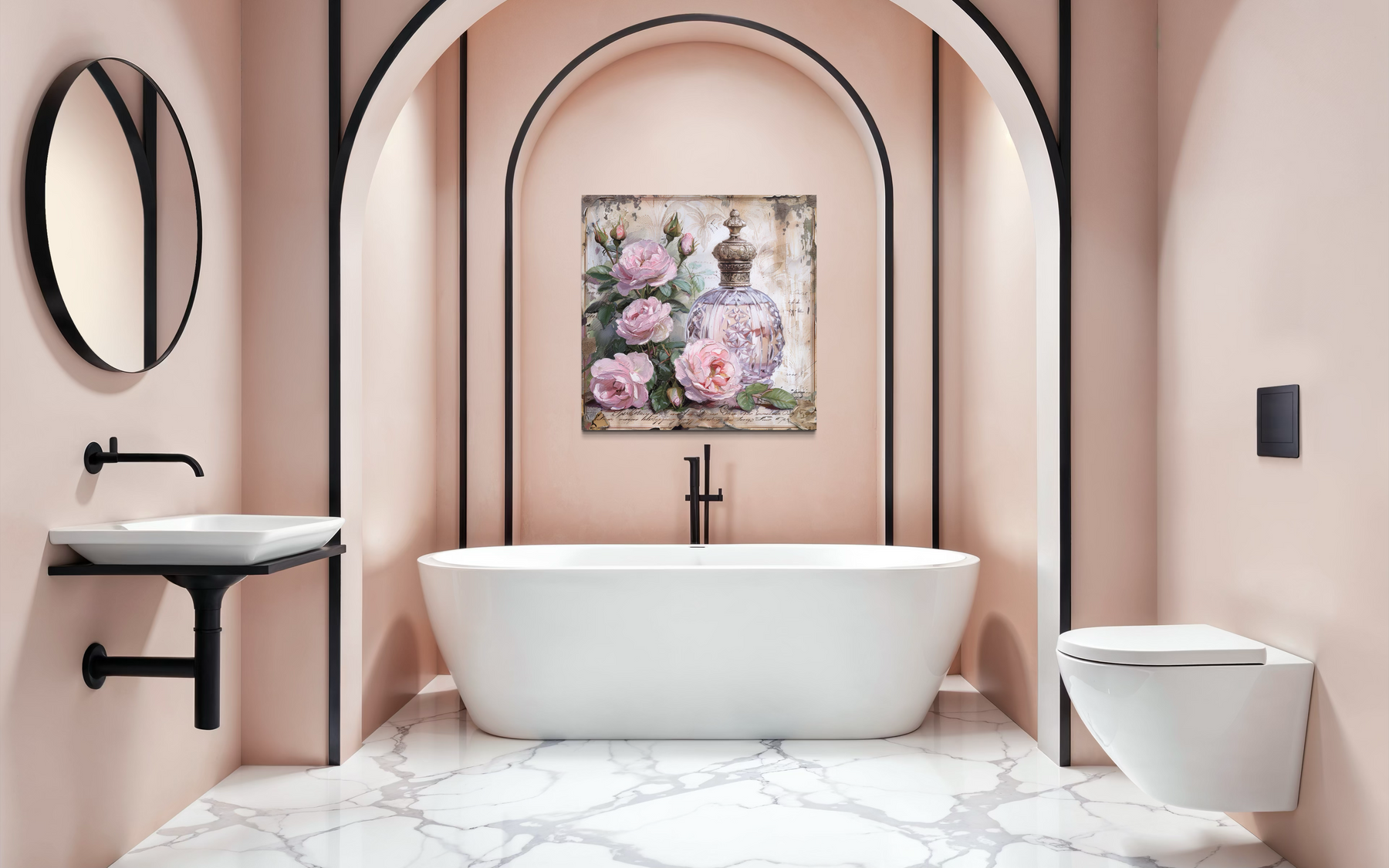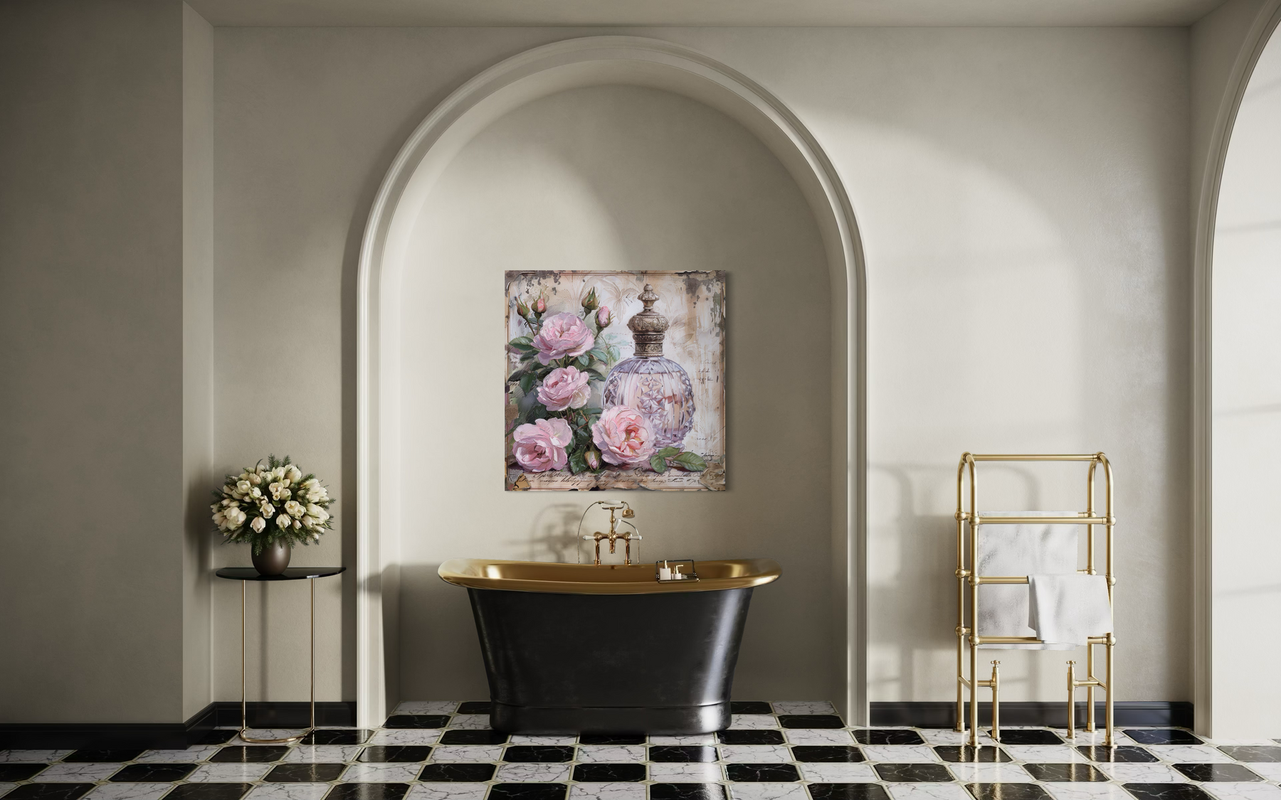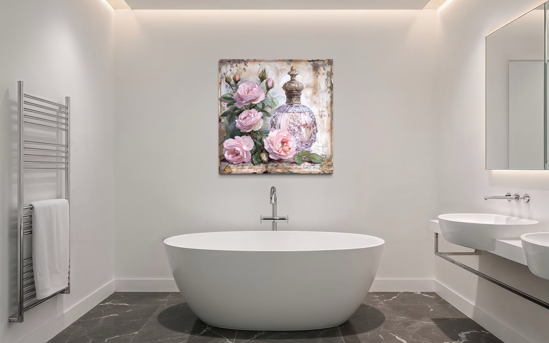 La palette se compose de roses poudrés, de crèmes douces, de blancs antiques et de gris patinés, le tout sur un fond noir légèrement vieilli qui met en valeur les détails délicats du flacon de parfum. Des reflets or pâle et lilas clair scintillent délicatement à la surface, conférant à l'œuvre une impression de luminosité et de profondeur. Les roses semblent fraîchement cueillies, leurs pétales peints avec un souci du détail qui évoque à la fois le réalisme et une douceur vintage. Le fond, orné d'une inscription discrète et de motifs estompés, ajoute de la profondeur sans détourner l'attention du flacon. Ces couleurs douces permettent à l'œuvre de s'harmoniser facilement avec des carreaux clairs, des plans de travail en marbre et des accessoires métalliques vieillis. Elle est particulièrement mise en valeur par des serviettes roses délicates, des étagères en bois naturel ou des touches pastel dans les tons crème et blanc. Grâce à son harmonie tonale, cette toile imprimée s'adapte à toutes les ambiances, des touches printanières à la chaleur hivernale. Chaque nuance a été choisie pour apporter une touche de romantisme discret et une texture visuelle raffinée à votre salle de bain. Le flacon de parfum rayonne doucement de l'intérieur de sa composition, soutenu par des couches de couleurs qui restent intemporelles et apaisantes.