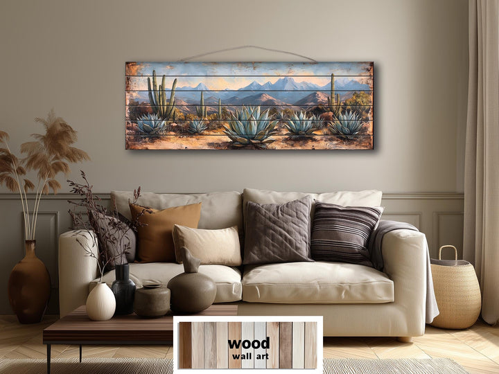 Décoration murale horizontale en bois vieilli représentant des plantes d'agave du désert du Sud-Ouest