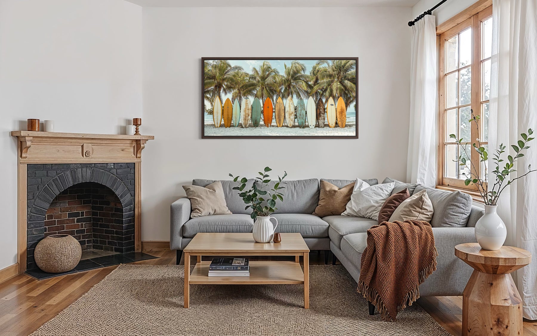Cette toile encadrée représentant des planches de surf sur la plage a été conçue pour les intérieurs qui évoquent le calme côtier, l'esprit surfeur et l'énergie estivale décontractée. Son format horizontal s'adapte aux murs larges et la rend parfaite au-dessus des canapés, des lits, des consoles d'entrée ou des buffets, dans les maisons de plage comme dans les appartements lumineux en ville aux touches côtières. Le motif s'intègre parfaitement à un décor naturel : tapis en jute, bois clair, coussins en lin et palmiers d'intérieur. Que vous aménagiez une véranda, un pool-house ou un cottage de plage, cette décoration murale représentant des planches de surf sur la plage crée un point focal central à la fois léger et intentionnel. Dans les espaces plus modernes, elle apporte une touche de personnalité et de texture, surtout associée à des monochromes simples ou à des tons doux. Son cadre lui confère un aspect soigné qui ne nécessite ni style ni superposition : cette toile se suffit à elle-même. Pour les amoureux du surf, du soleil et de la liberté du sable, c'est une célébration visuelle de tous les bienfaits de la vie au bord de l'eau. Laissez cette scène apporter rythme et luminosité à votre mur sans surcharger l'espace. Gardez la plage à portée de main avec cette décoration murale encadrée représentant des planches de surf sur la plage.